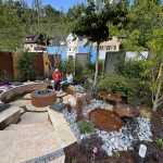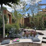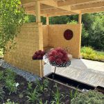 Meinen Lieblingsgarten habe ich gefunden. Hier stimmt für mich alles. Die rostige Stahloptik, die drehbare Holzliege – so eine will ich schon lange haben -, der Whirlpool und die Feuerstelle. Darum herum eine Bepflanzung, welche Schatten und Erholung spendet. Einmal alles einpacken bitte.