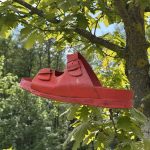 Überall finden sich rot angemalte Schuhe. Mir haben besonders die Gummistiefel im Moor gefallen. Wie kleine rote Vögel stehen sie wachsam Spalier im Feuchtgebiet. Mich haben die roten Schuhe in den Bann gezogen.