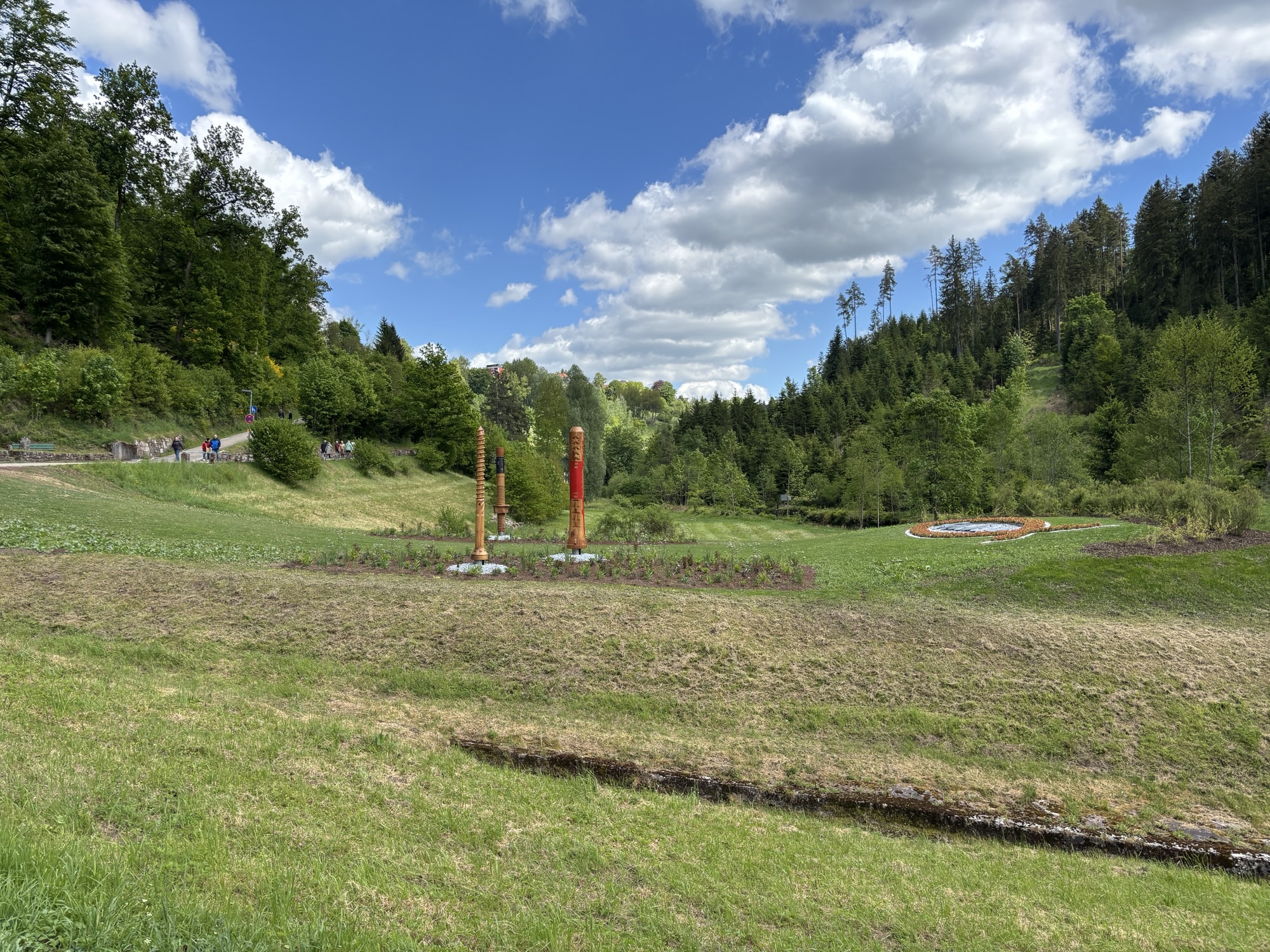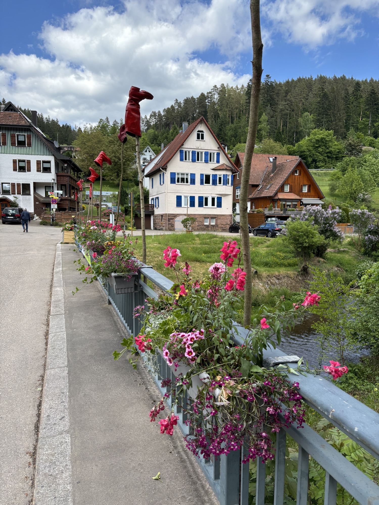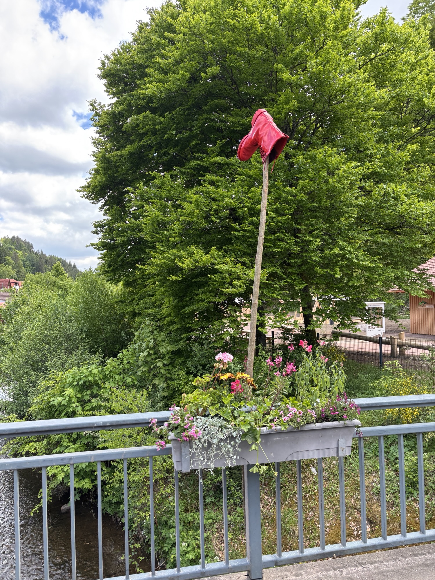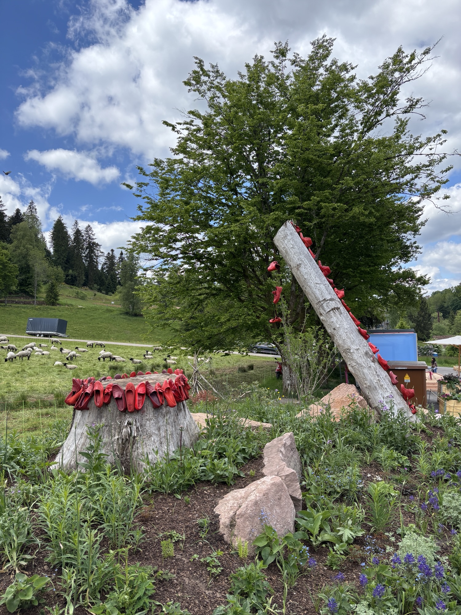 Alternativ gibt es einen wieder 1,5 km langen Weg, der Bergab nicht ganz so beschwerlich ist. Wieder vorbei an idyllischen Landschaften und roten Schuhen. Eigentlich ist der Besuch dieser Gartenschau mehr eine Schwarzwaldwanderung. Mit dem Wissen und gut vorbereitet kann aber auch sie absolut genossen werden.