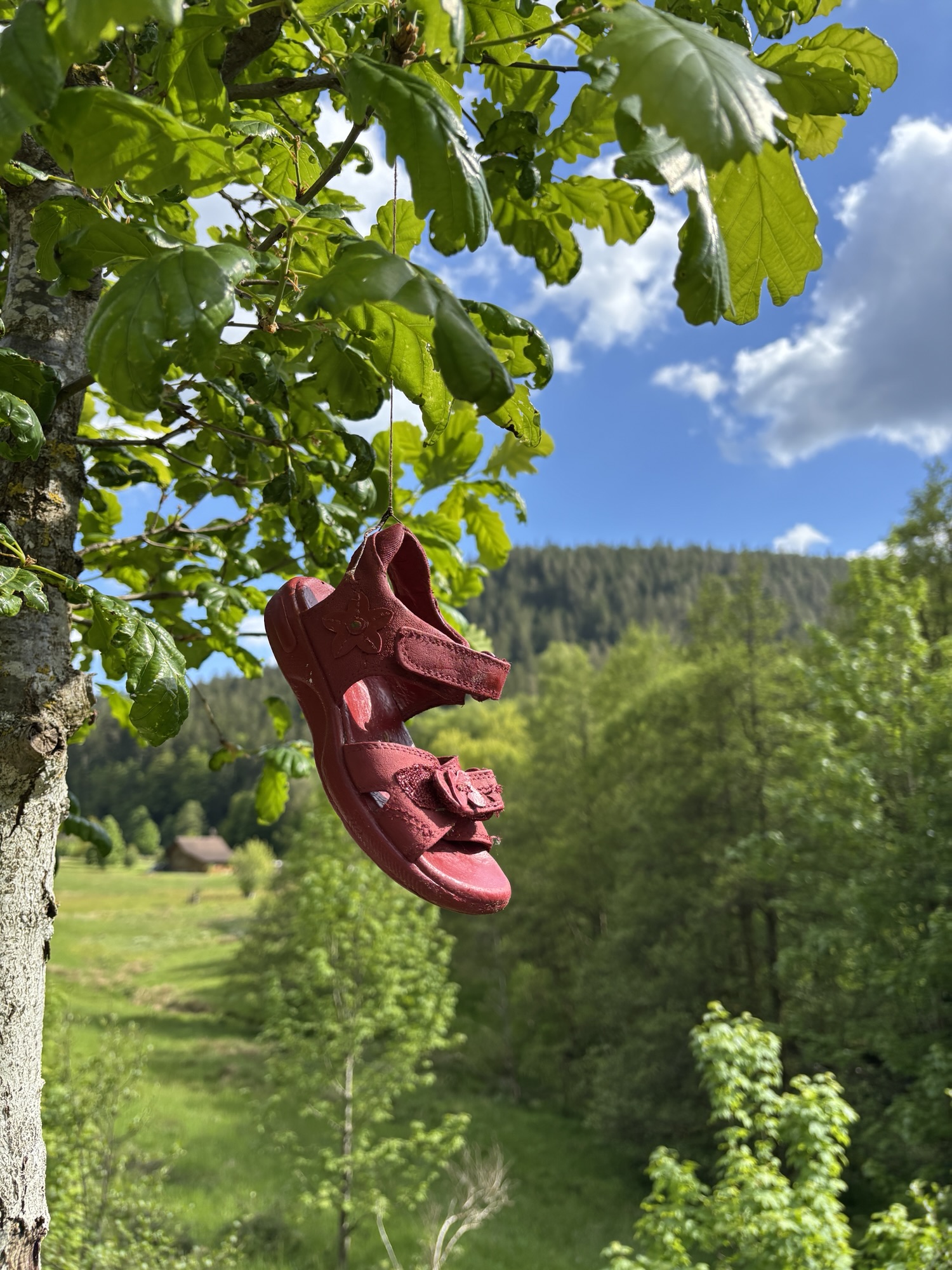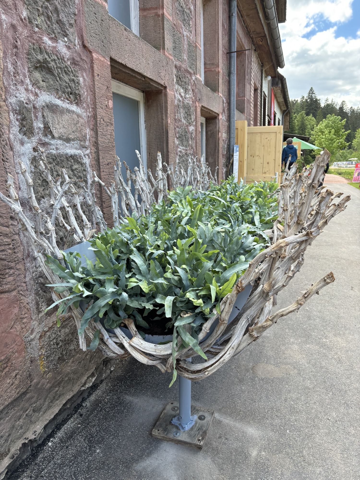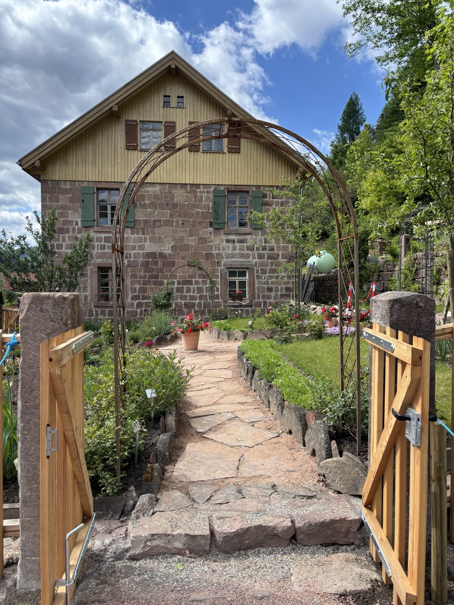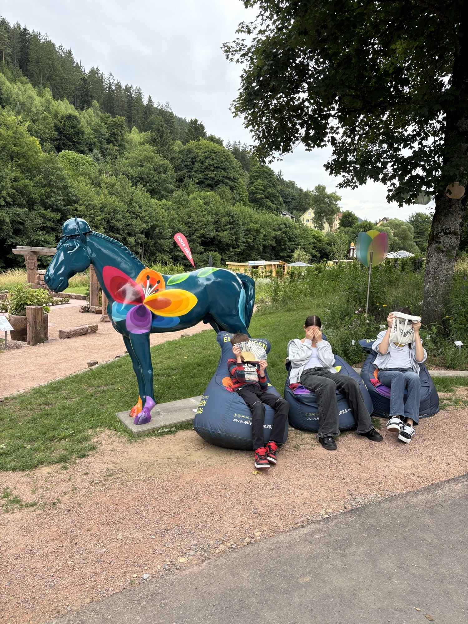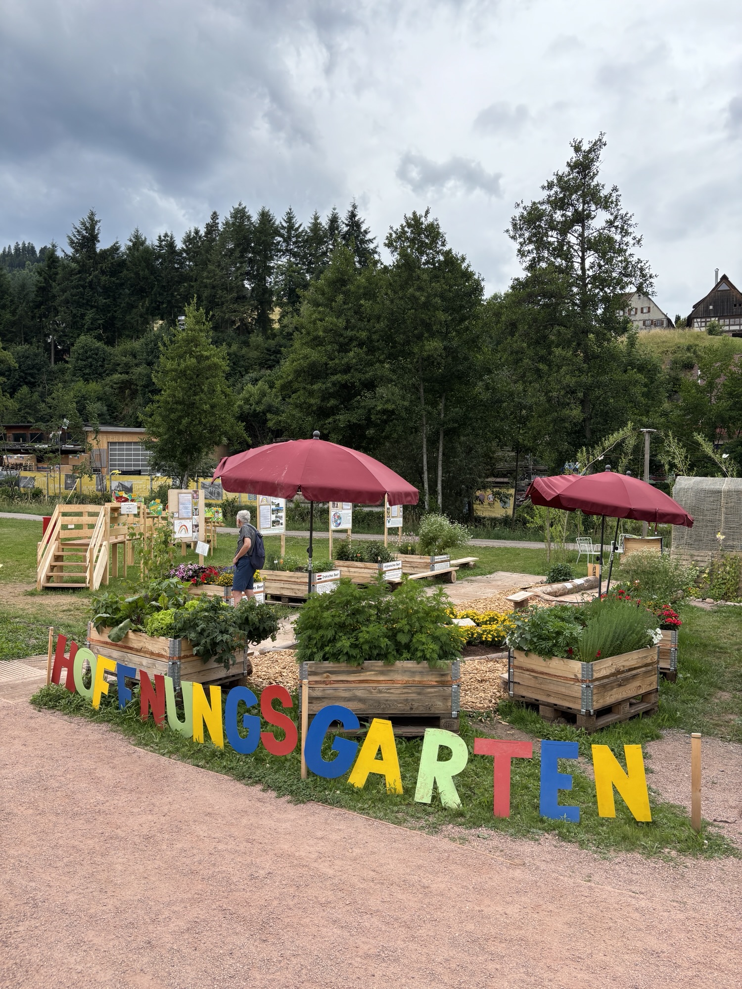 Alternativ gibt es einen wieder 1,5 km langen Weg, der Bergab nicht ganz so beschwerlich ist. Wieder vorbei an idyllischen Landschaften und roten Schuhen. Eigentlich ist der Besuch dieser Gartenschau mehr eine Schwarzwaldwanderung. Mit dem Wissen und gut vorbereitet kann aber auch sie absolut genossen werden.