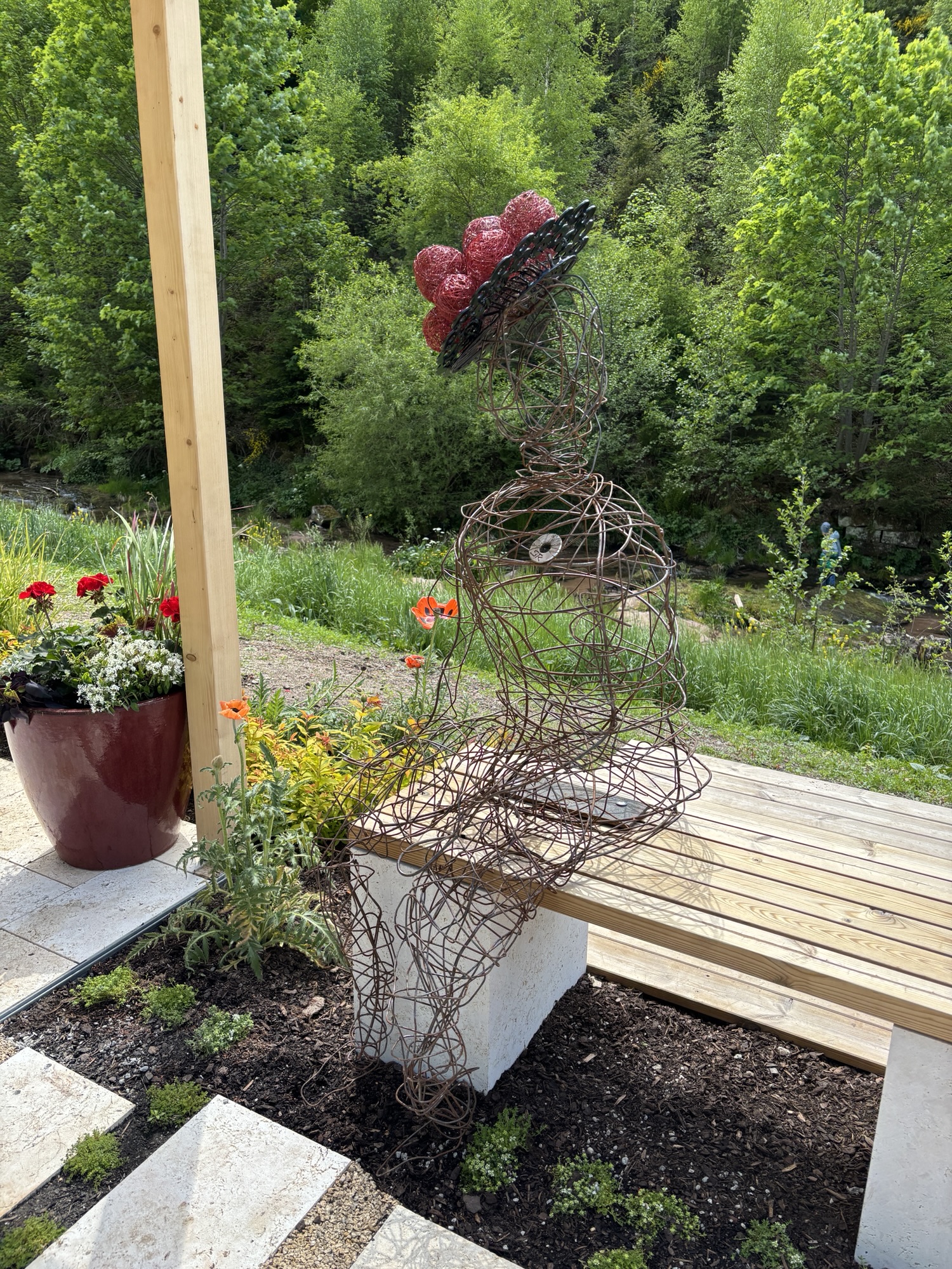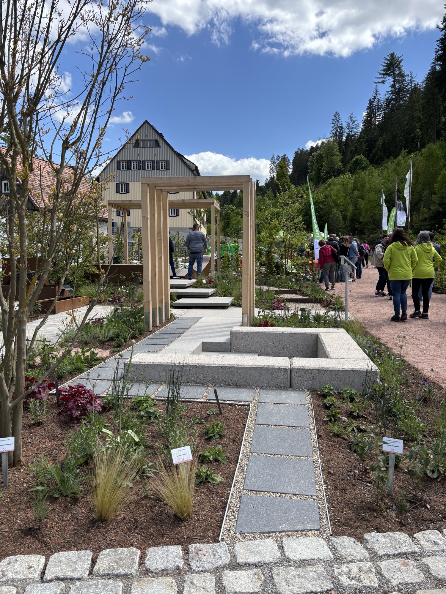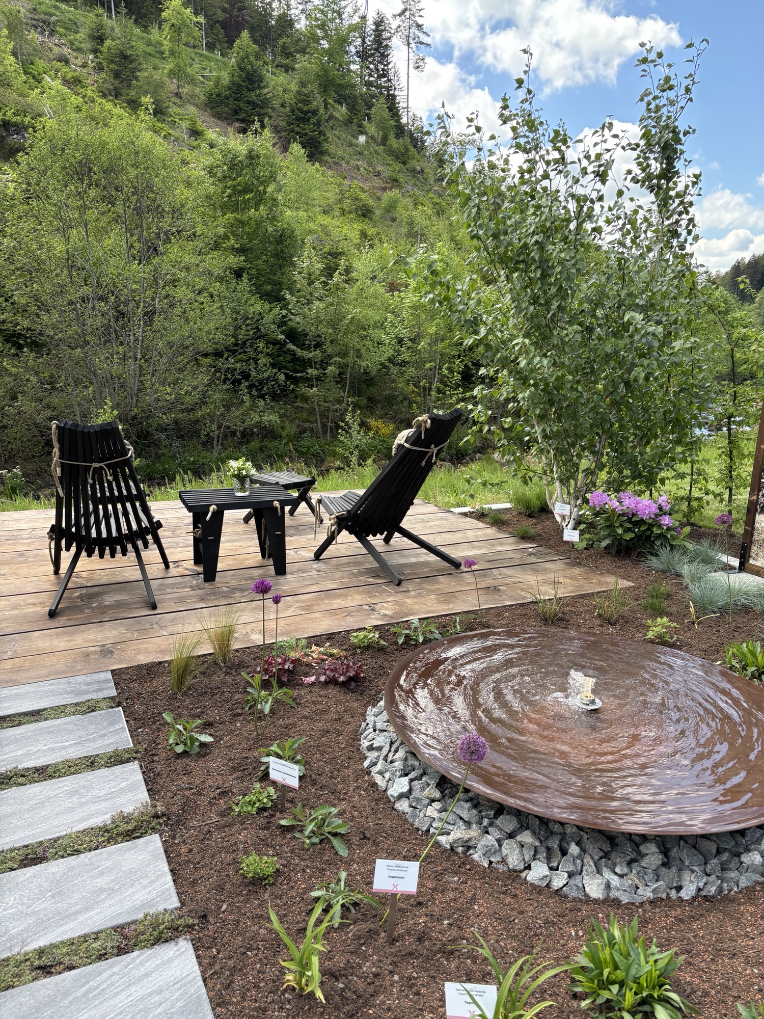 In allen Gärten schwingt die stimmungsvolle Schwarzwaldlandschaft – hier am Forbach – wieder. Holz, Wasserelemente, Metall und viel Grün, welches in den kommenden Monaten noch üppinger werden wird.