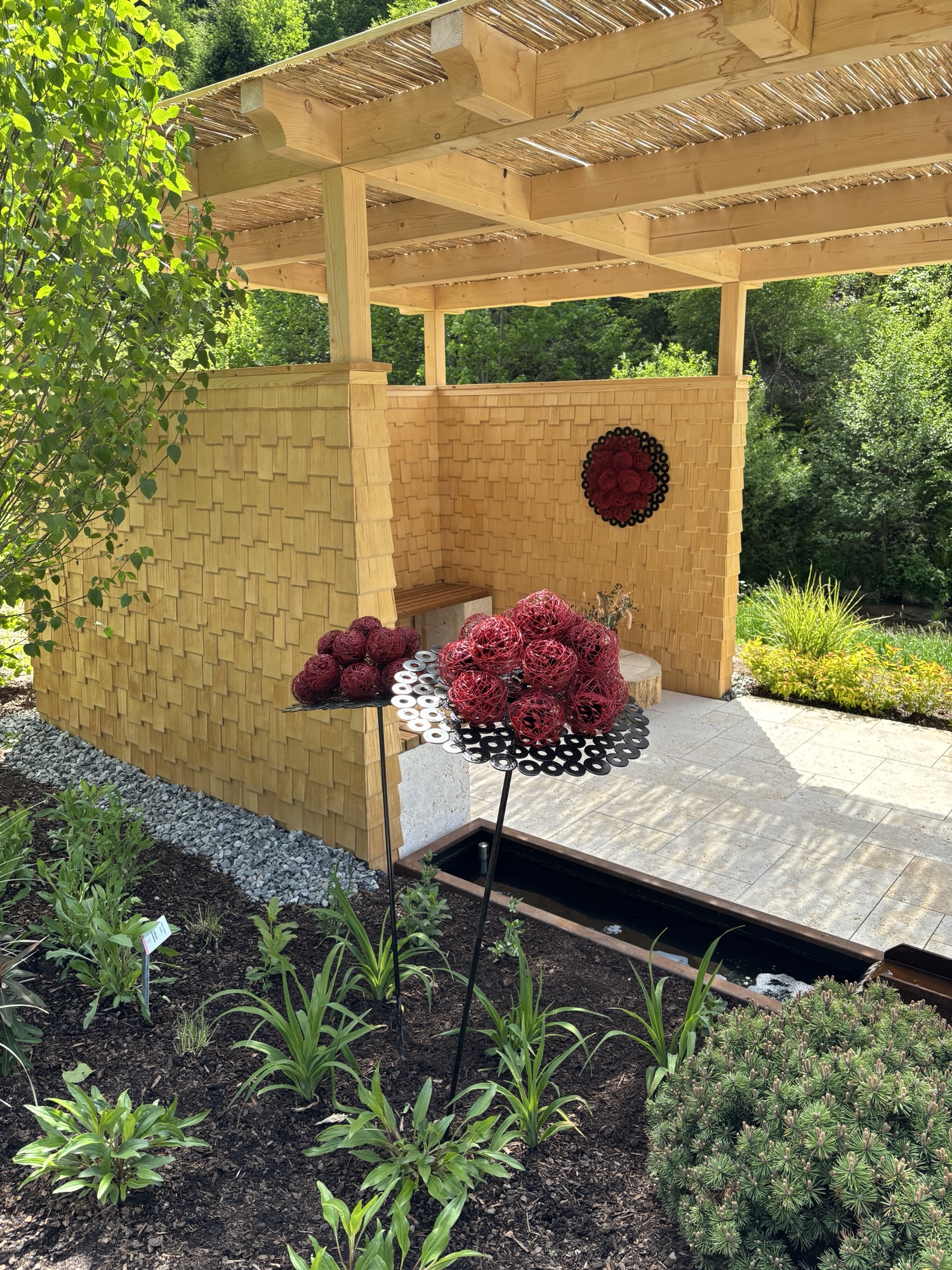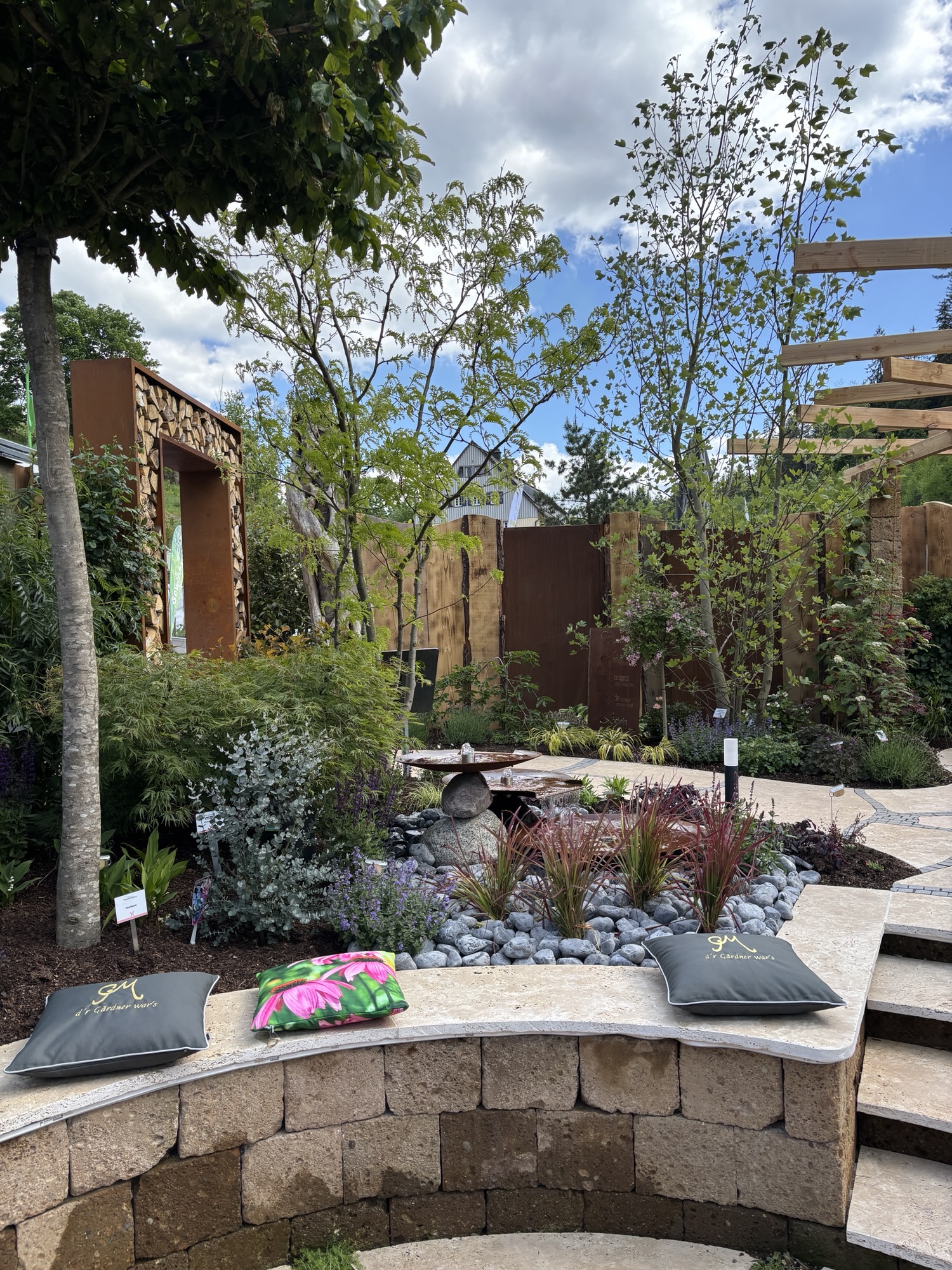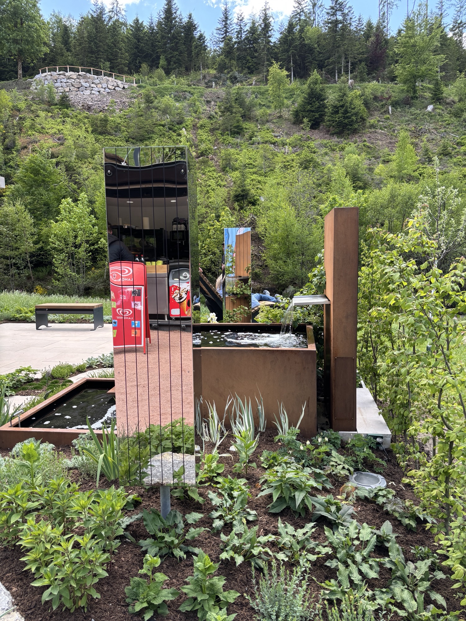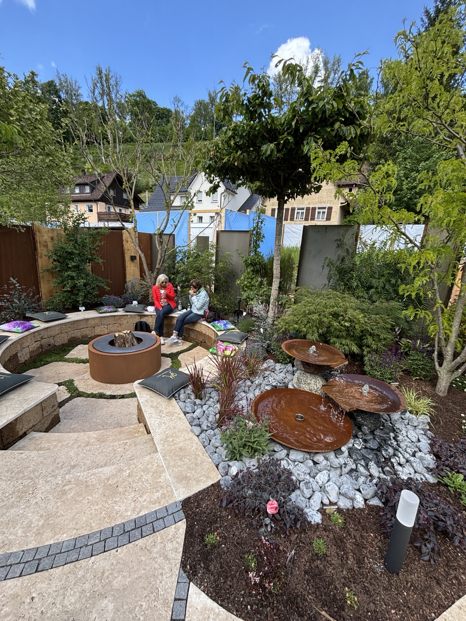 Meinen Lieblingsgarten habe ich gefunden. Hier stimmt für mich alles. Die rostige Stahloptik, die drehbare Holzliege – so eine will ich schon lange haben -, der Whirlpool und die Feuerstelle. Darum herum eine Bepflanzung, welche Schatten und Erholung spendet. Einmal alles einpacken bitte.