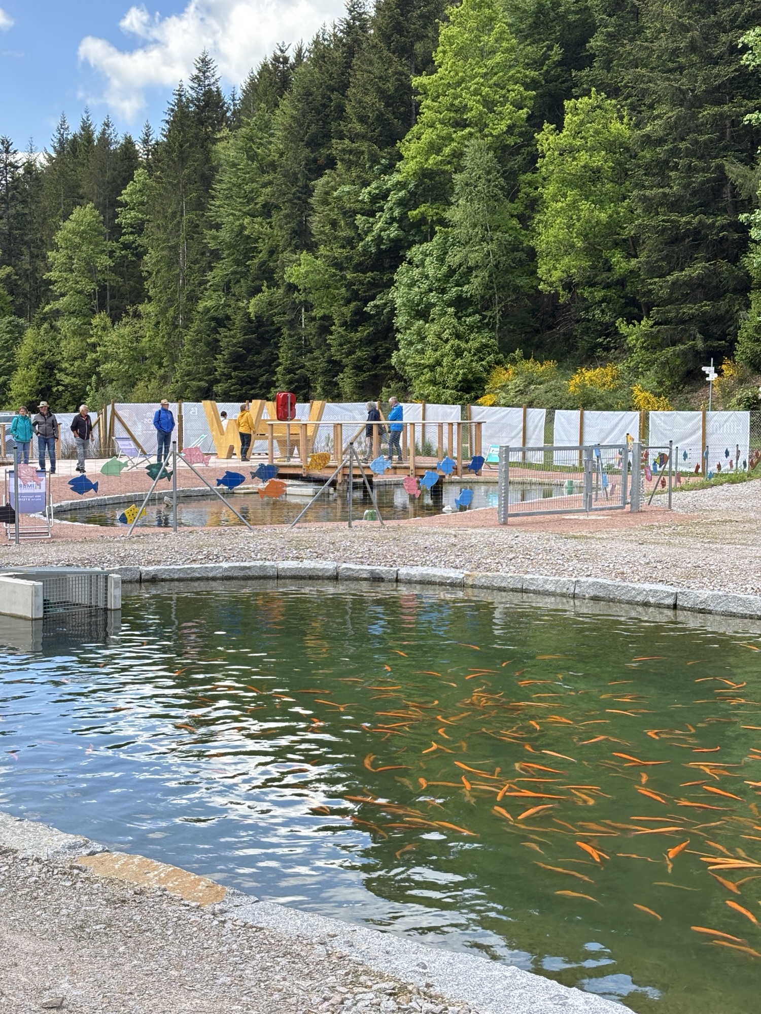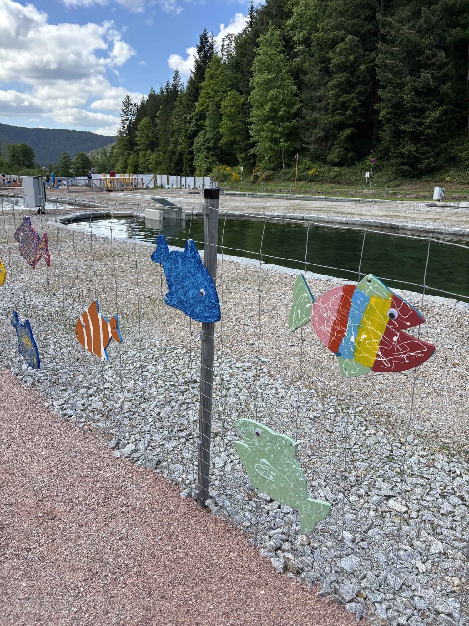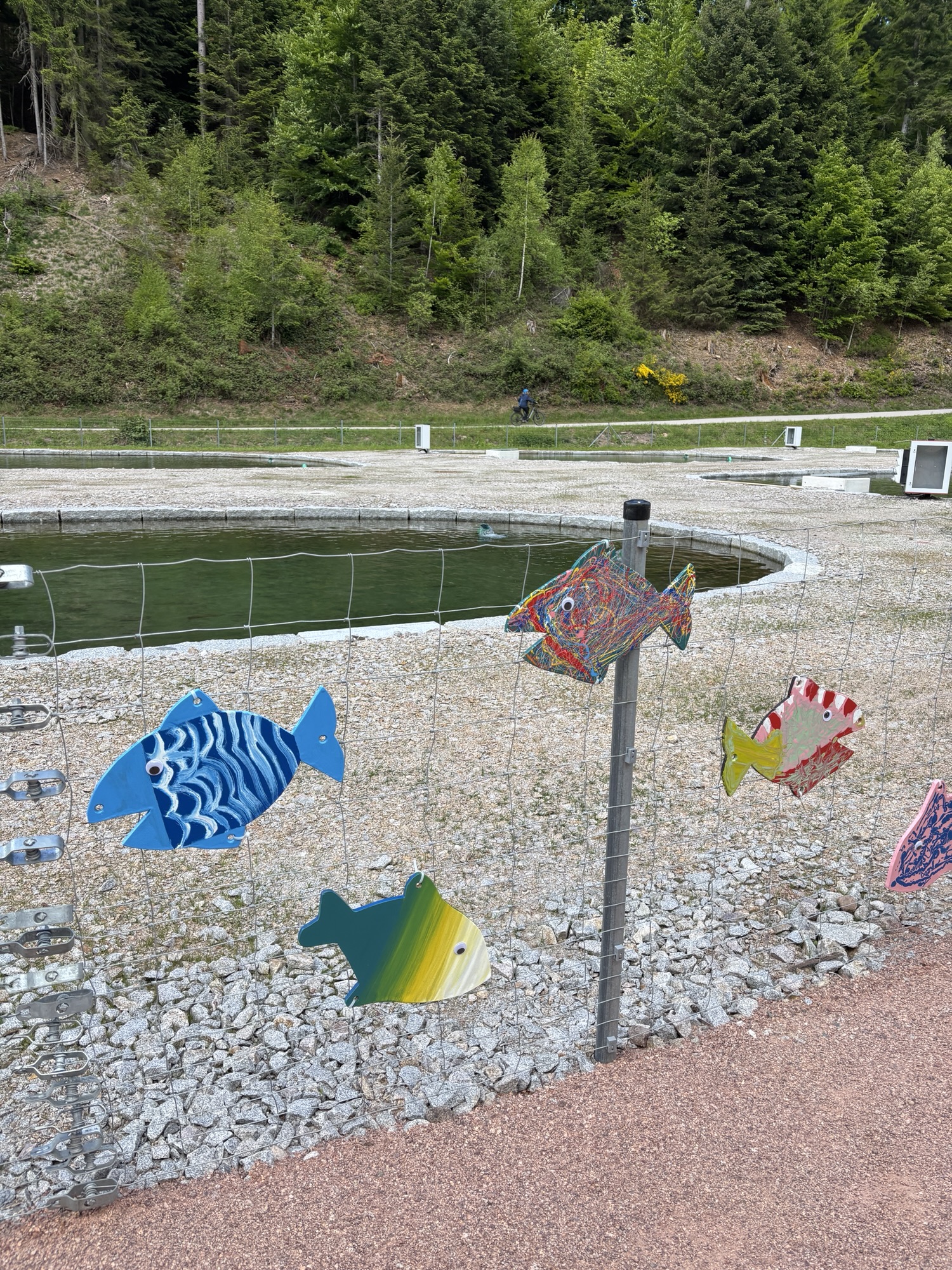 Unterhalb der Bergwerksausstellung wurden Teiche für eine Fischzucht angelegt. Umrahmt von bunten Fischen, welche in der Christopherusschule gestaltet wurden.