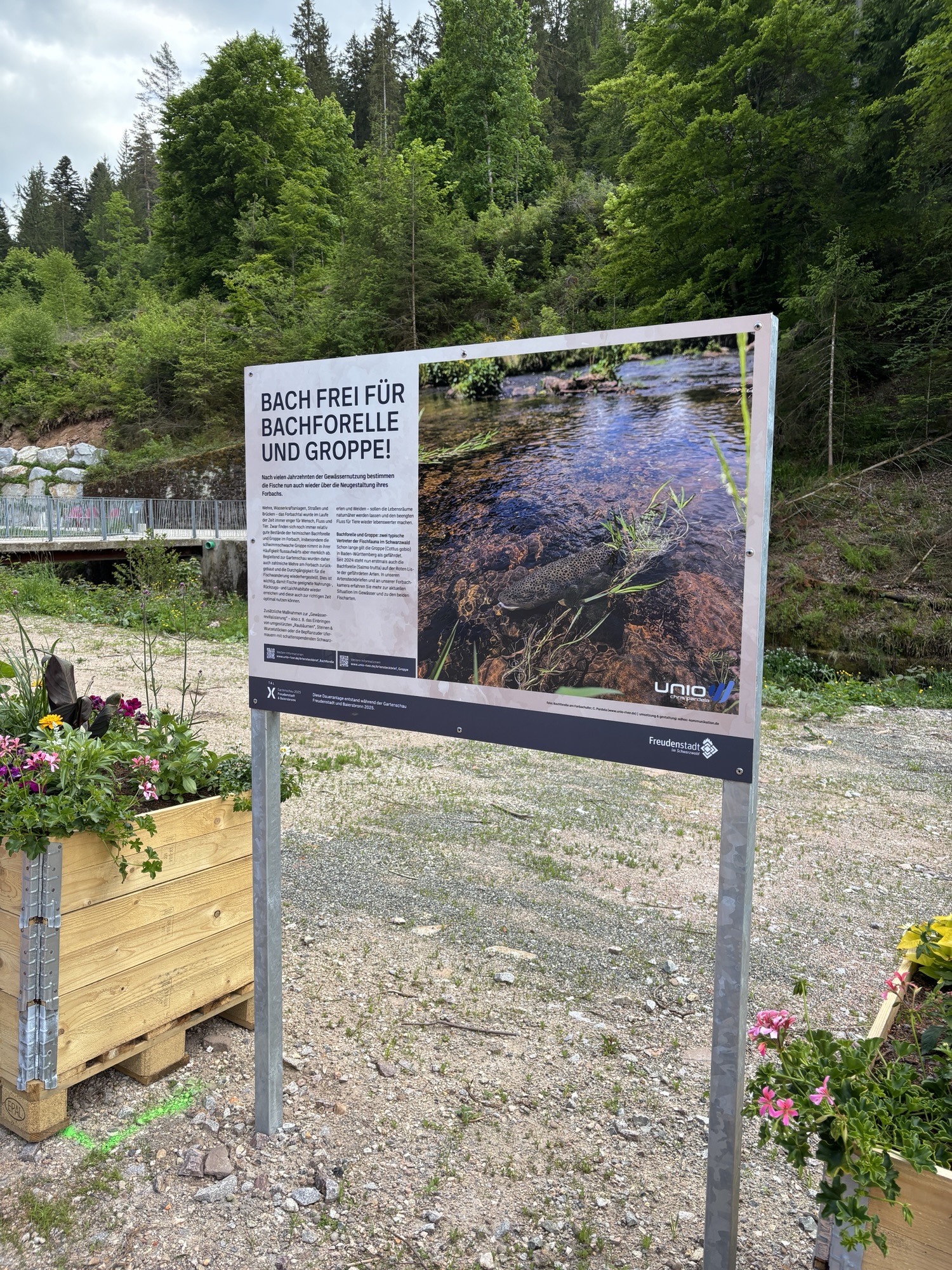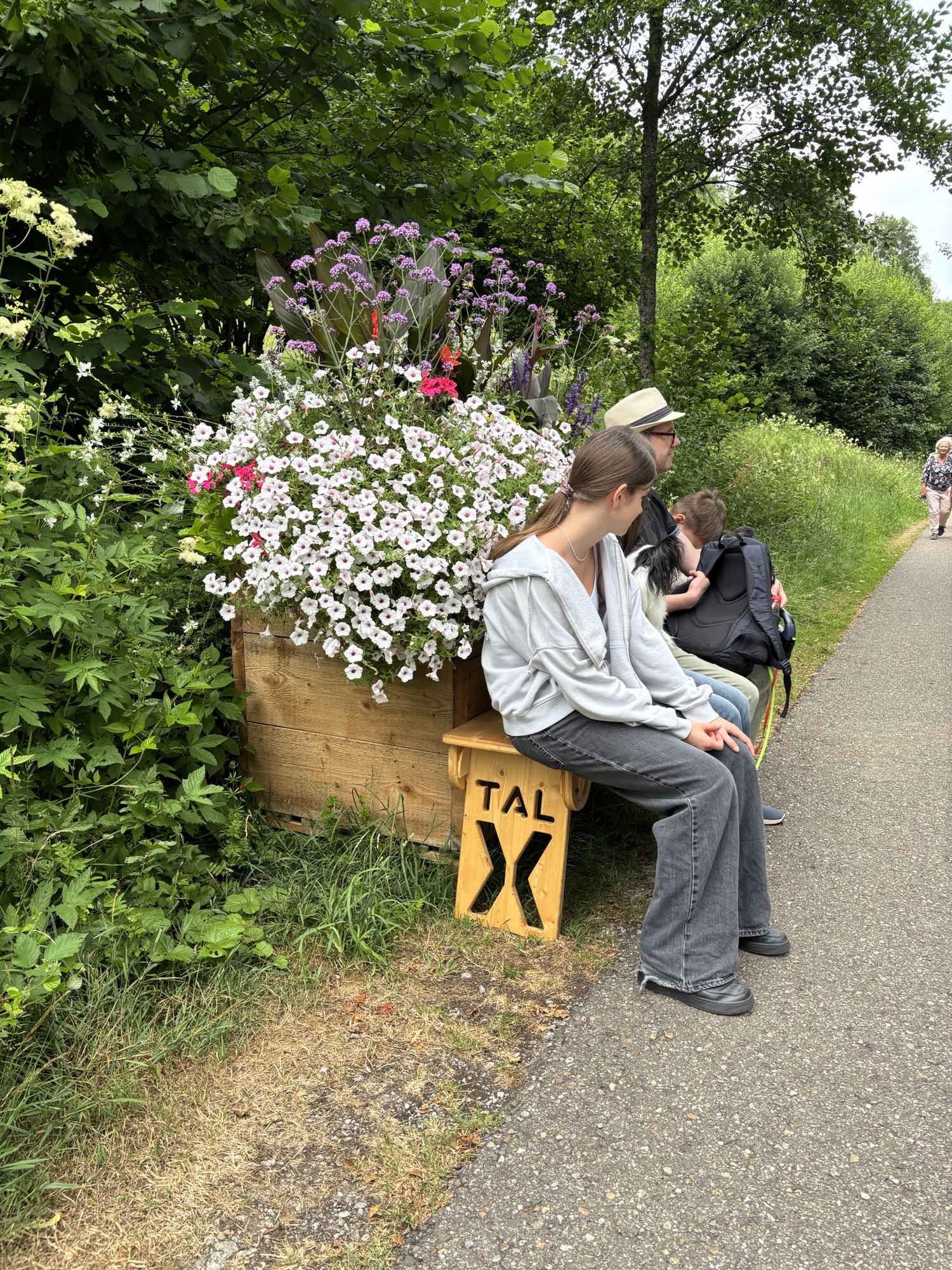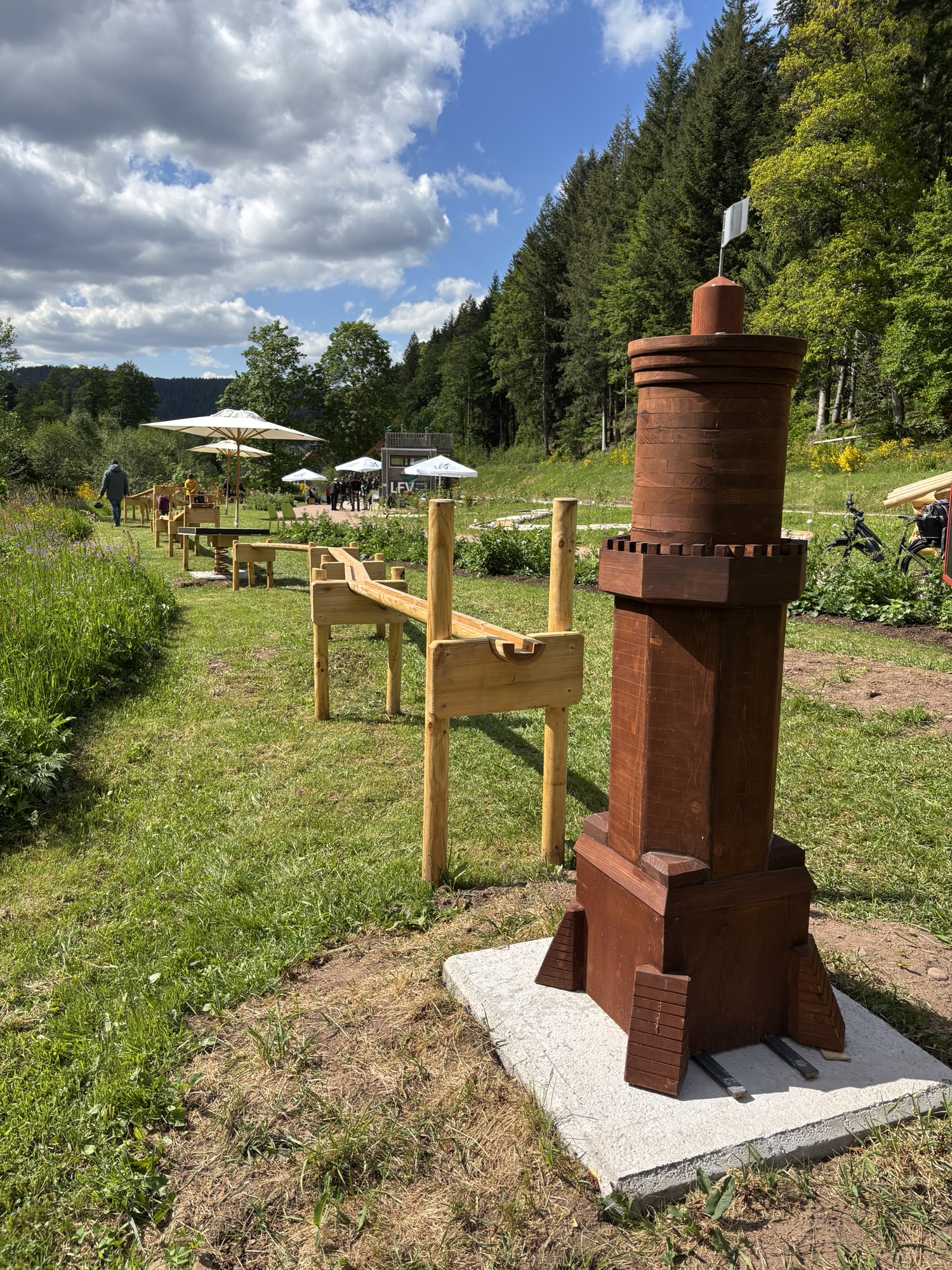 Weiter geht es zum Gartendorf. Dafür geht es wieder rund 2 durch das Forbach Tal. Der Weg führt entlang der blauen Meile und ist die die meiste Zeit schön schattig. Auch für Rastmöglichkeiten ist gesorgt. Unterhalten wird mit weiteren Kunstprojekten.