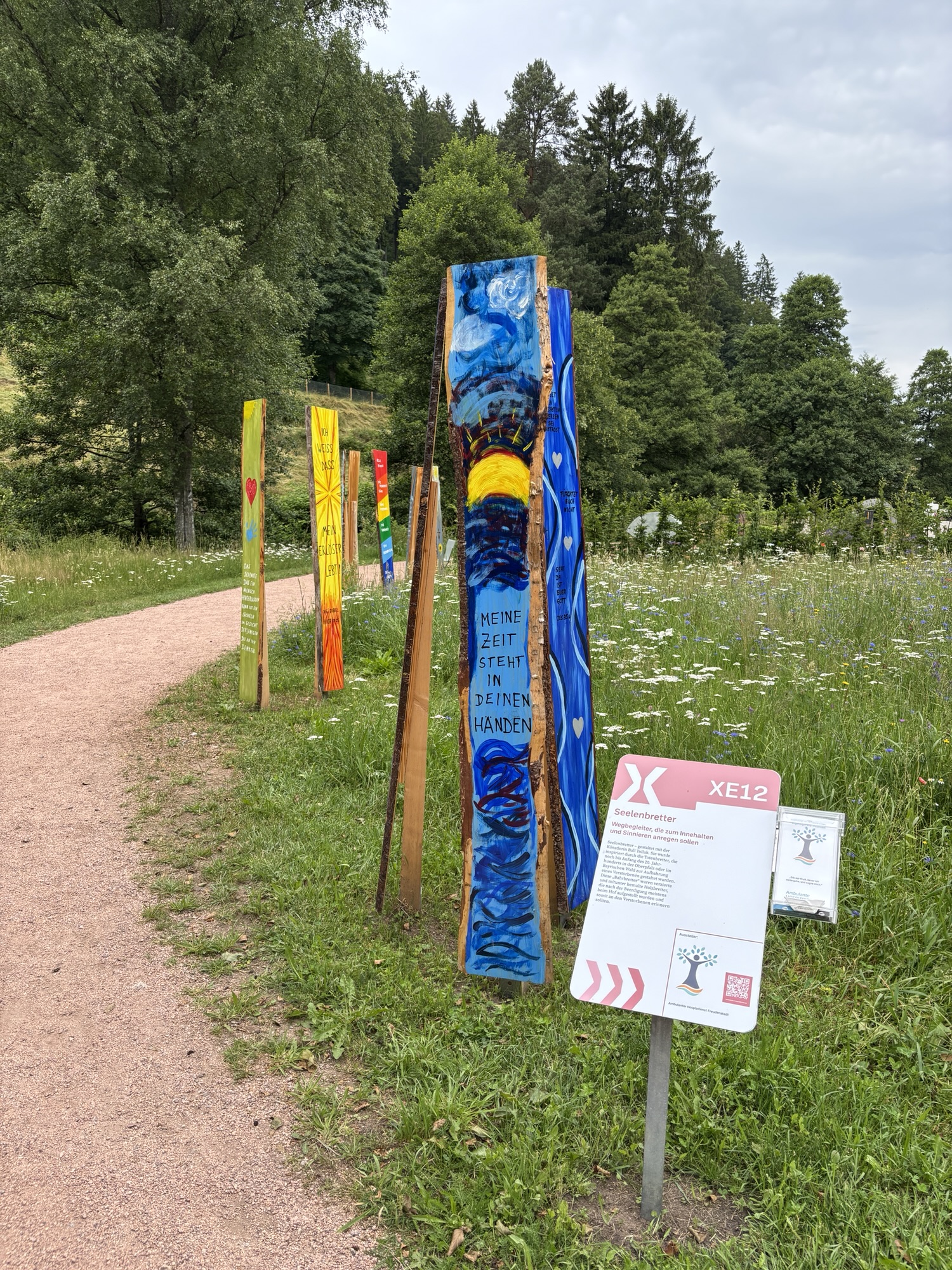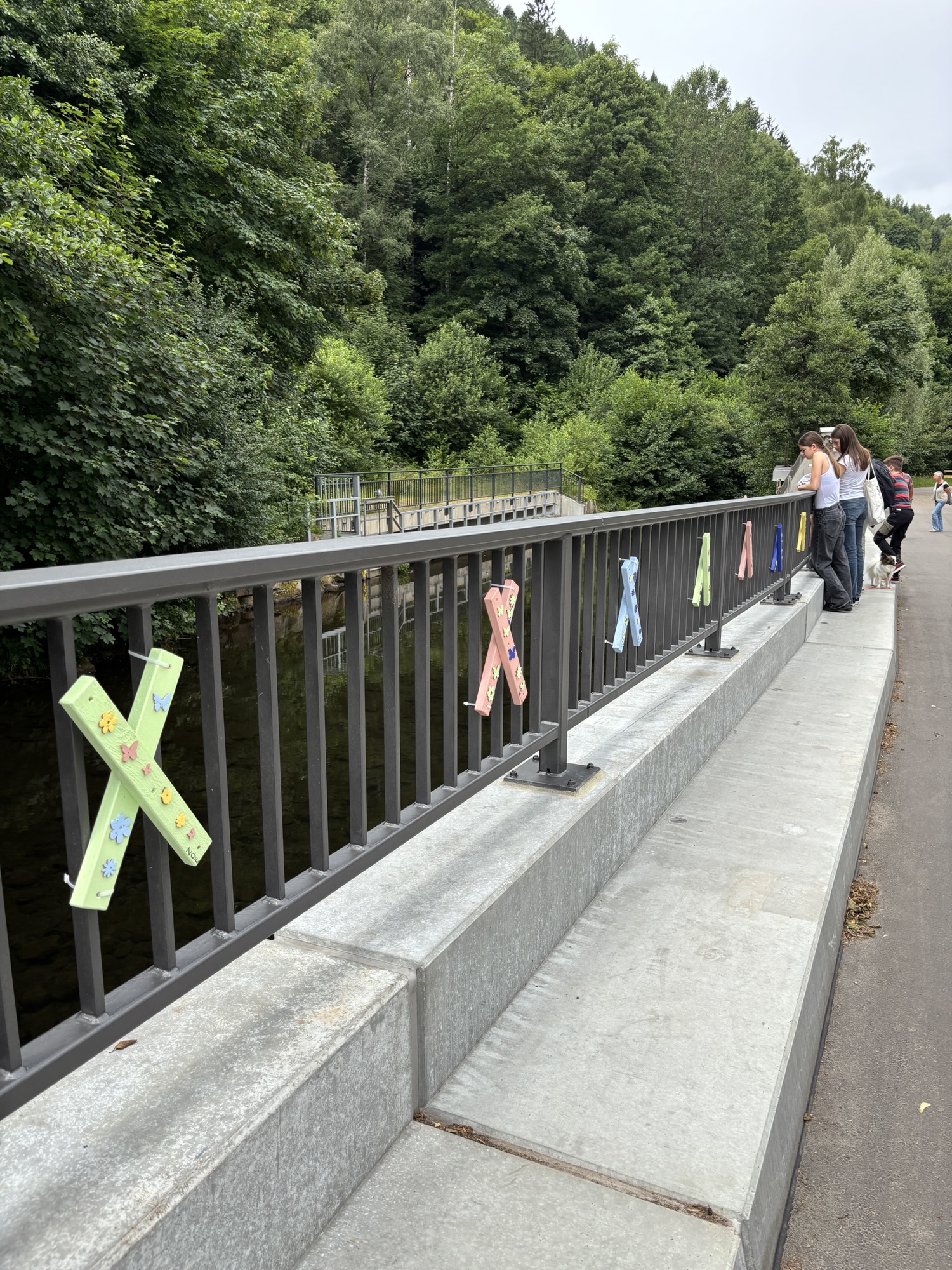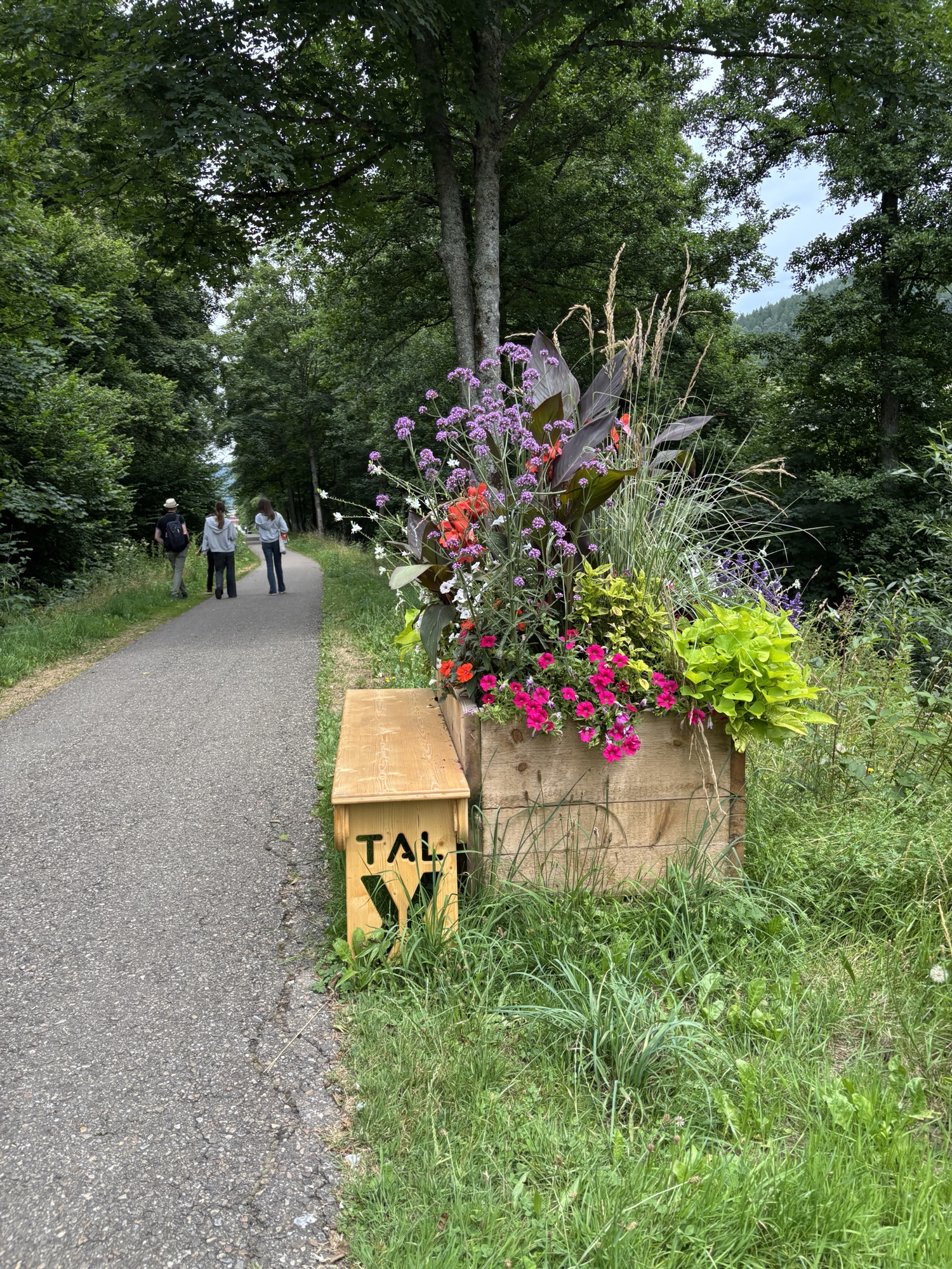 Weiter geht es zum Gartendorf. Dafür geht es wieder rund 2 durch das Forbach Tal. Der Weg führt entlang der blauen Meile und ist die die meiste Zeit schön schattig. Auch für Rastmöglichkeiten ist gesorgt. Unterhalten wird mit weiteren Kunstprojekten.
