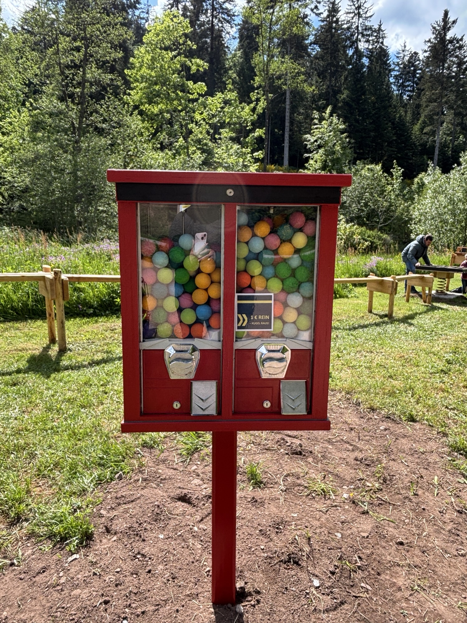 Direkt unterhalb der Fischteiche findet sich ein Informationscontainer der Landesforst Verwaltung BW. Mich hat aber die spaßige Kugelbahn davor magisch angezogen. Gleich mal ausprobiert! Für einen Euro kann aus einem Kaugummi Automaten eine bunte Kugel gezogen werden. Heute eindeutig mein Lieblingsbereich. Weiter geht’s!