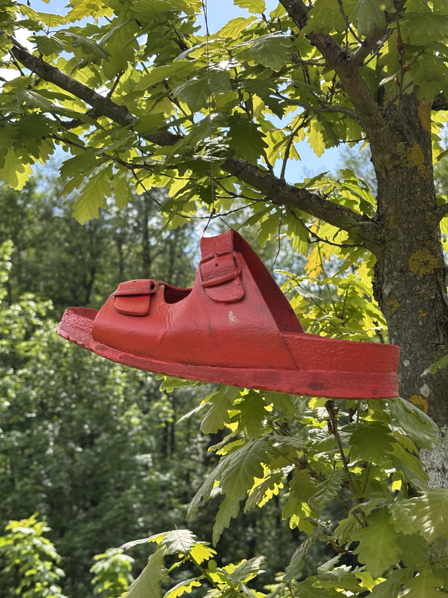 Überall finden sich rot angemalte Schuhe. Mir haben besonders die Gummistiefel im Moor gefallen. Wie kleine rote Vögel stehen sie wachsam Spalier im Feuchtgebiet. Mich haben die roten Schuhe in den Bann gezogen.