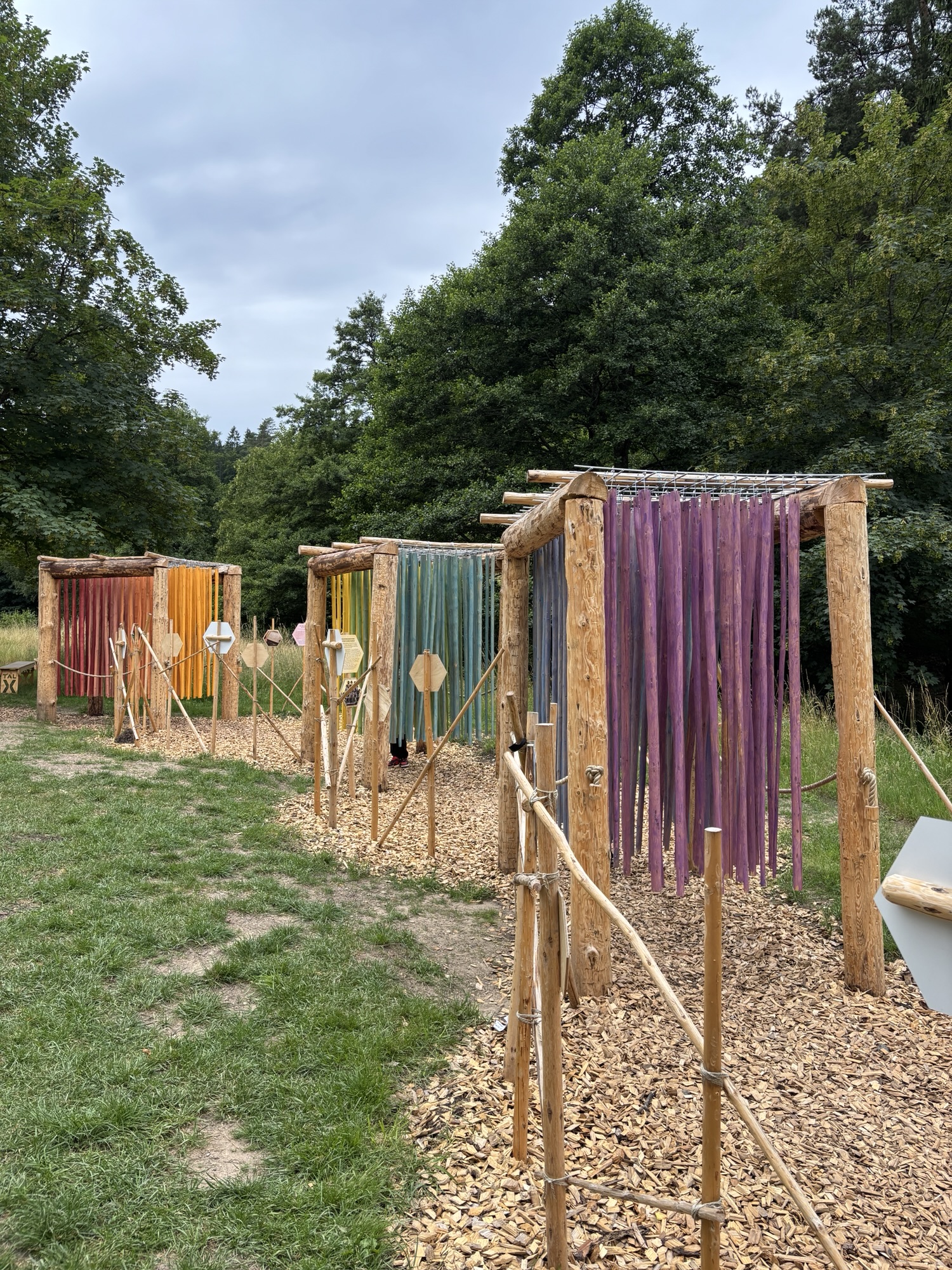 Es wurde dann Anfang Juli, bis zu meinem nächsten Besuch. Im Juli sieht das Tal-X ganz anders aus. Die Blumenbeete sind noch bunter. Zinnien, Spinnenblumen, Hirse, Löwenmäulchen uvm. strahlen in knalligen Farben. Das Gemüse wird reif und die vielen Installationen sind eingebettet in sattem Grün. Zwischen den Themengärten gibt es viele, tolle Installationen. Mein persönliches Highlight ist ein Kunstprojekt aus – ich nenne es mal – klingenden Wandelgängen. Unbedingt ausprobieren.