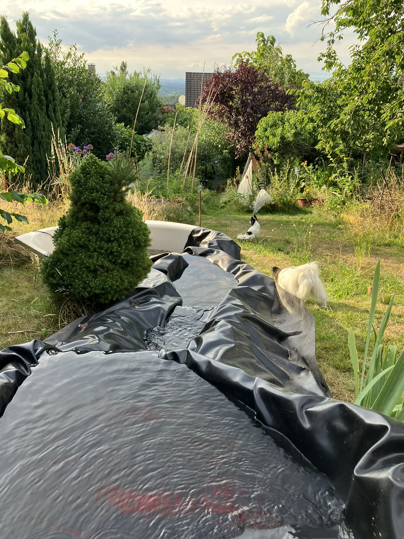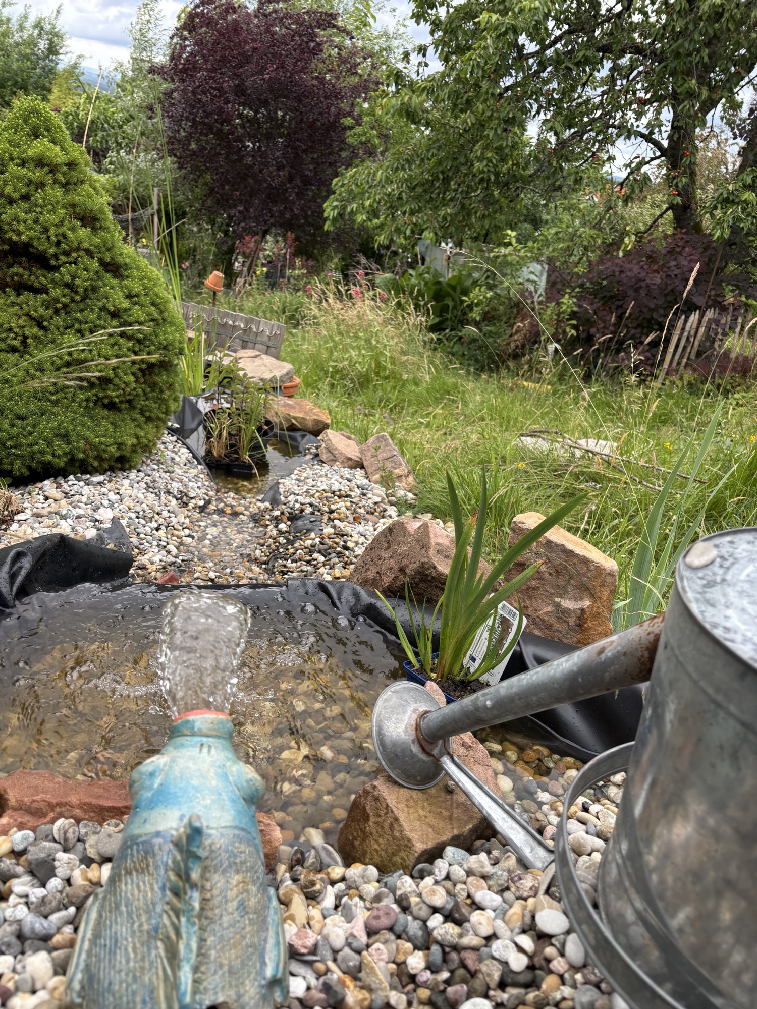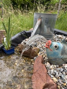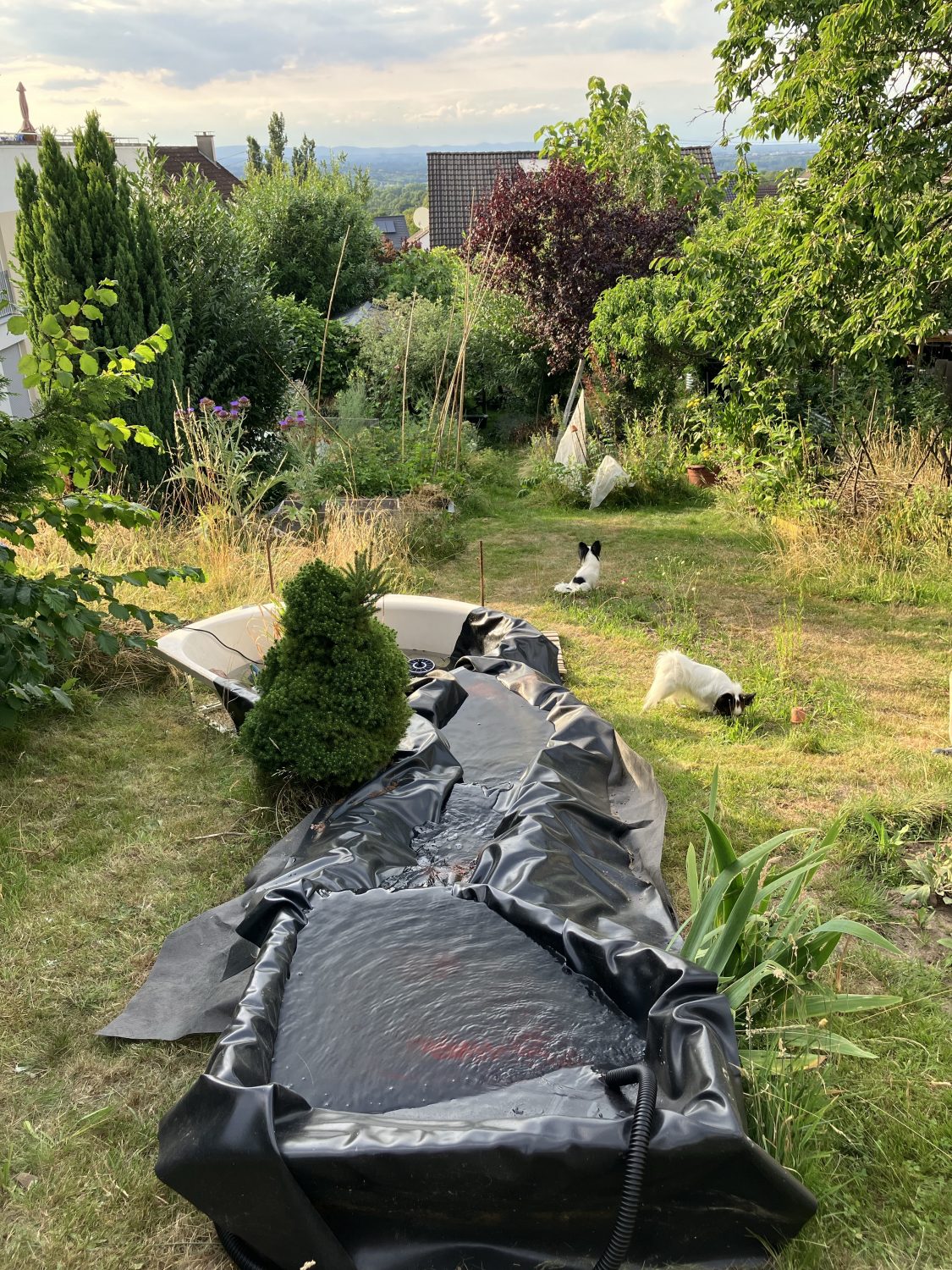 Das – ich nenne es mal – Drappieren der Teichfolie hat einiges an Zeit in Anspruch genommen. Ziel war es ein stimmiges Bild zu finden, bei dem das Wasser schön plätschernd nach unten läuft. Dabei sollte das Wasser auch wirklich im Kreislauf bleiben und nicht in der Wiese versickern. Mal musste ich da nachgraben. Dann musste ich dort den Wall weiter erhöhen.
