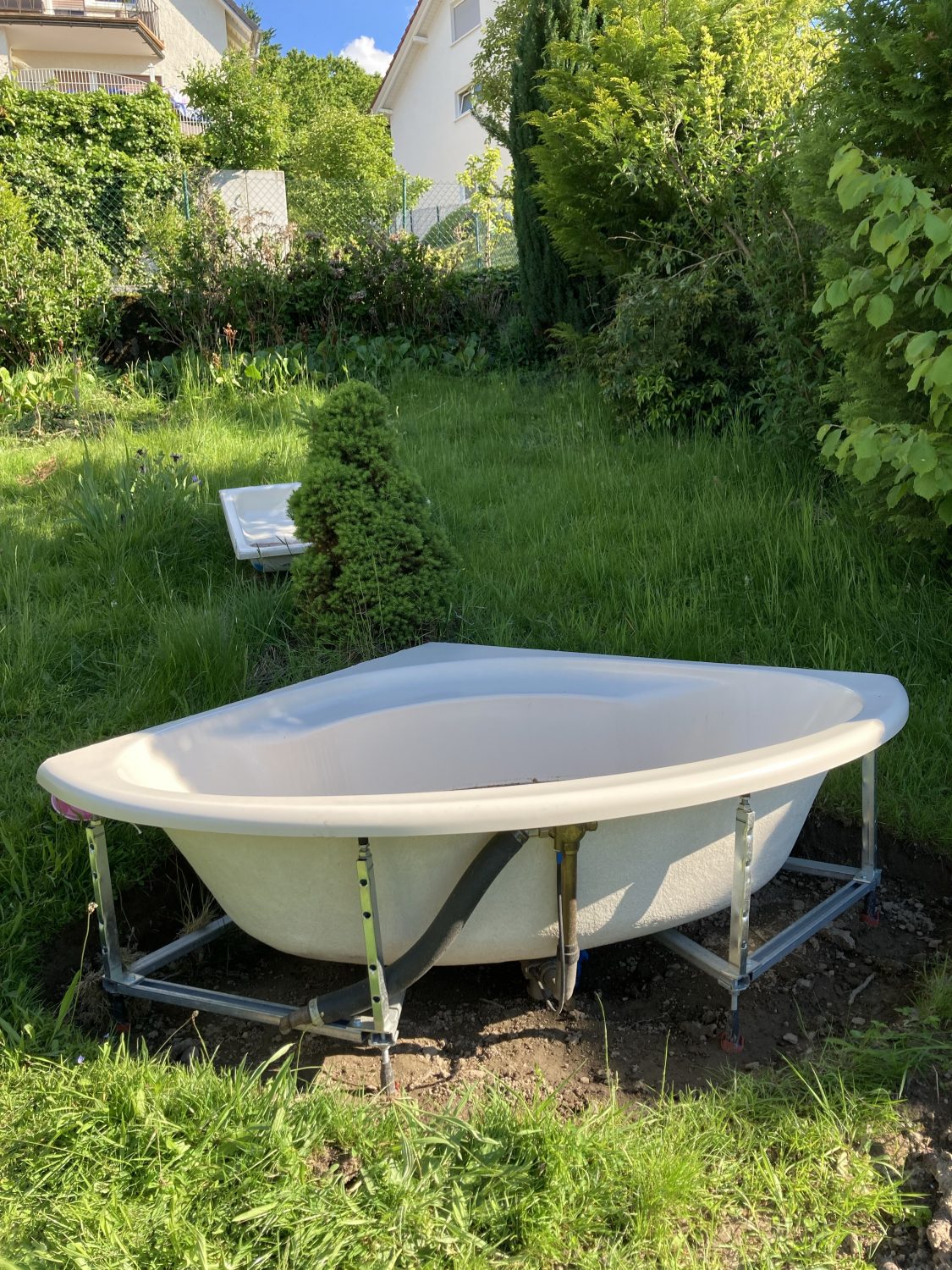 2019 war ein Geschenk von meinem lieben Freund die Initalzündung für das Projekt Teich mit Bachlauf: Eine alte Eckbadewanne samt Duschwanne aus dem Bad seiner Eltern. Ich gehöre zur Kategorie „Horder und Sammler“, alter Krempel hat für mich immer ein Potential. Ausserdem hatte ich in dieser Wanne auch selbst Baden dürfen in einer Zeit, als ich noch keine Badewanne hatte. Kurz habe ich sogar überlegt, ob ich daraus eine Outdoor Badewanne machen soll.