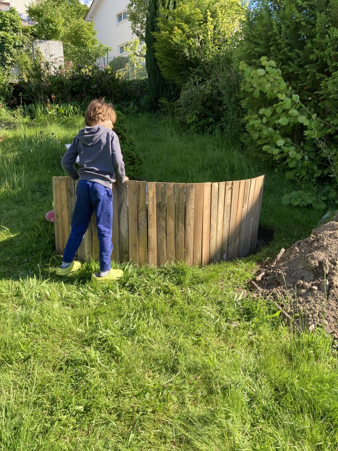 Nun stand alles bereit. Alleine: Die Energie anzufangen fehlte. Erst war es mal wieder zu heiß, dann kam Corona. Ich weiß nicht wie es euch in dieser Zeit ging. Aber mir haben diese Lockdown Phasen immer jeglich Energie geraubt. Es ging oft nur um eine Art geistiges Überleben. Das war bei uns immer gemütliches Sitzen mit einem Gläschen unter dem Weidebogen. Den schweißtreibenden Aushub auch nur anzufangen, einfach nicht machbar. Was wohl die Besucher unseres Gartens beim Tag der offenen Tür 2020 gedacht haben?