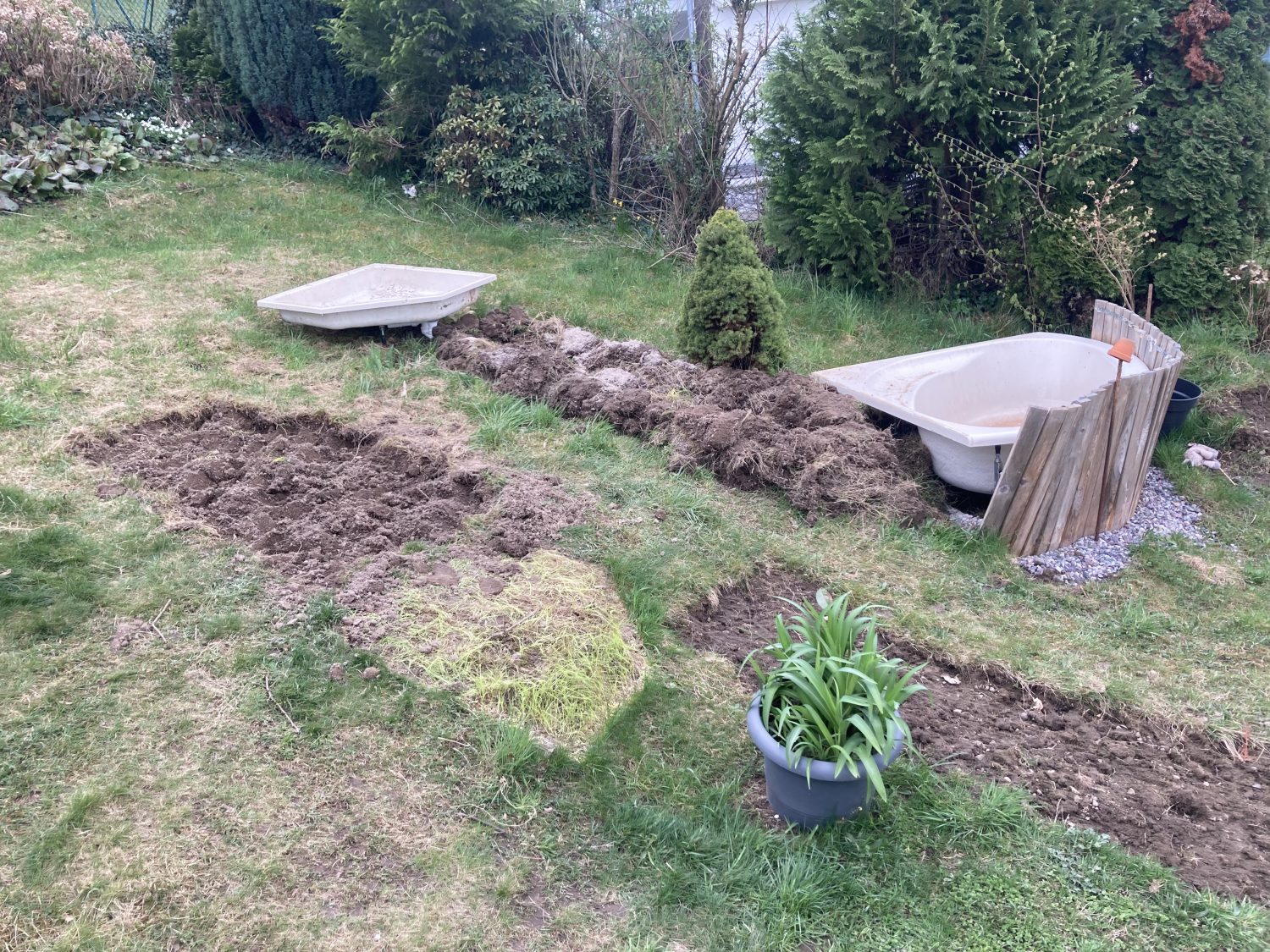 Bis ins Frühjahr 2021 hat es gedauert für die nächsten Arbeitsschritte. Da wurde ein Plateau gegraben für die große Wanne, Kies besorgt und darauf als Drainage Schicht verteilt. Die Idee, das untere Ende mit einem Erdwall zu verschließen haben wir schnell verworfen. Dafür hätten wir riesige Massen Erde bewegen müssen. Das Upcycling Projekt – zwei alte Rolllatenroste erst auseinander geschnitten und dann mit zwei Lochbändern verbunden – was zuerst als Provisorium gedacht war, wurde die Dauerlösung. Jetzt verdeckt das Lattenrost den Unterbau der Badewanne.