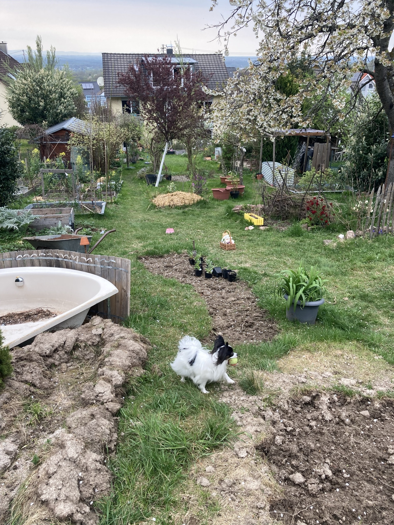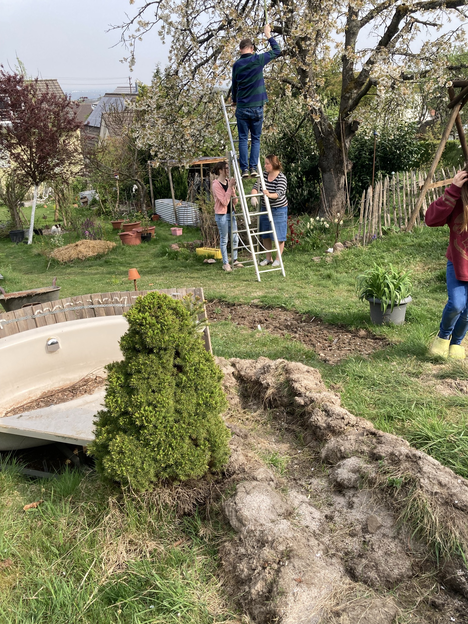 Klar, dass ich Badewanne und Duschwann sofort nahm, als er sie mir für den Teichbau anbot. Der Platz war schnell lokalisiert. Rechts oben im Garten, an der höchsten Stelle hat man einen gigantischen Blick in die Oberrheinische Tiefebene. Leider auch nur von dieser Stelle. Deshalb war dieser Platz im Garten schon immer für „Höheres“ bestimmt. Hier plane ich einen Sitzplatz, an dem der Bachlauf entlang führen soll. Für ein entspanntes Plätschern. Ein Haken hatte allerdings diese Stelle: Ein uralter Apfelbaum auf dem Grundstück des Nachbarn, ganz nah an der Grenze zu unserem Grundstück. Es war ihm anzusehen, dass er irgendwann umfällt. Und dann vielleicht auf uns oder zumindest dem Sitzplatz.