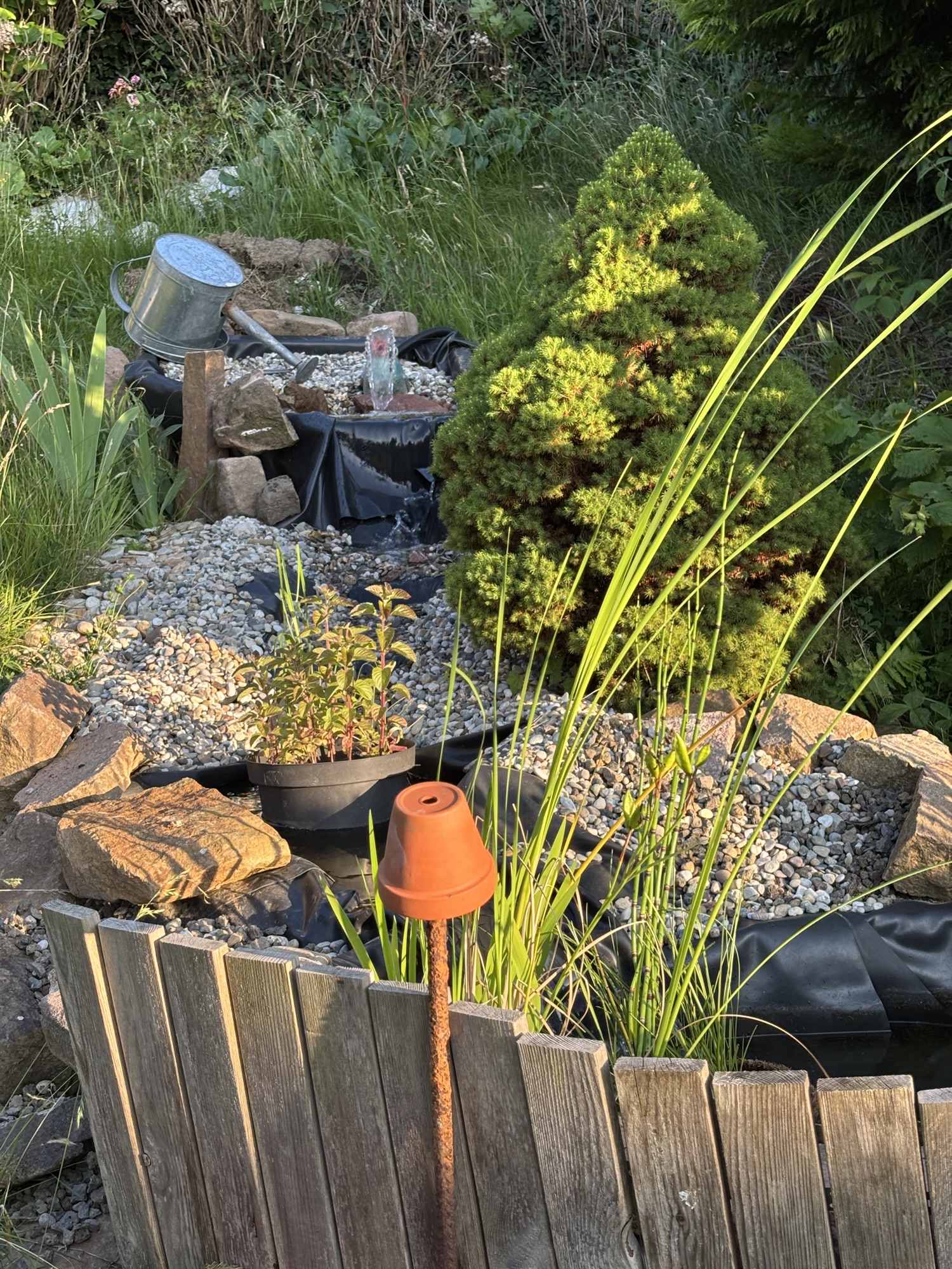 Aus Prinzip verwende ich keinen Beton für dieses Projekt. Das bedeutet aber auch, dass der Bachlauf immer in Bewegung ist und ich immer noch ab und zu nachjustieren muss. Egal, mir gefällt es so.