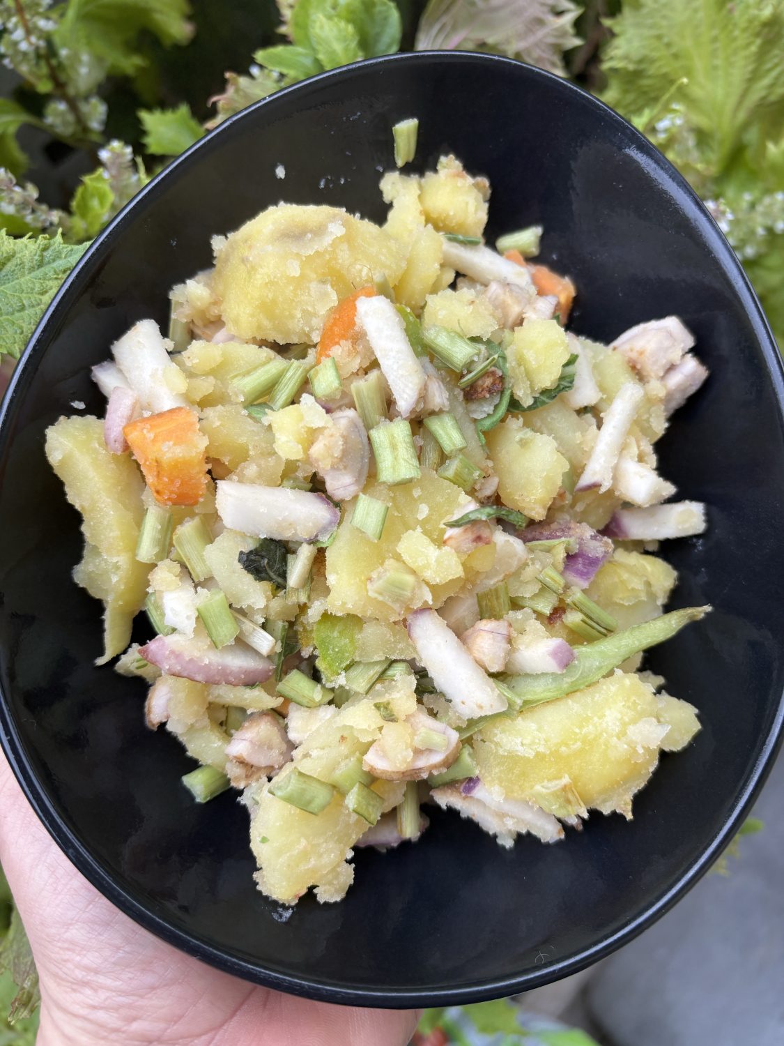 Bei meinem zweiten Versuch habe ich eine Nachtkerzenwurzel zusammen mit Rüben und Karotten aus dem Gemüsebeet in Ghee angebraten. Da ich gerne den Eigengeschmack des Gemüse schmecke, habe ich das Wurzelgemüse nur mit etwas Salz abgeschmeckt. Dazu ebenfalls in Ghee angebratene Kartoffeln. War mal etwas Anderes. Ich fand es wieder sehr lecker.
