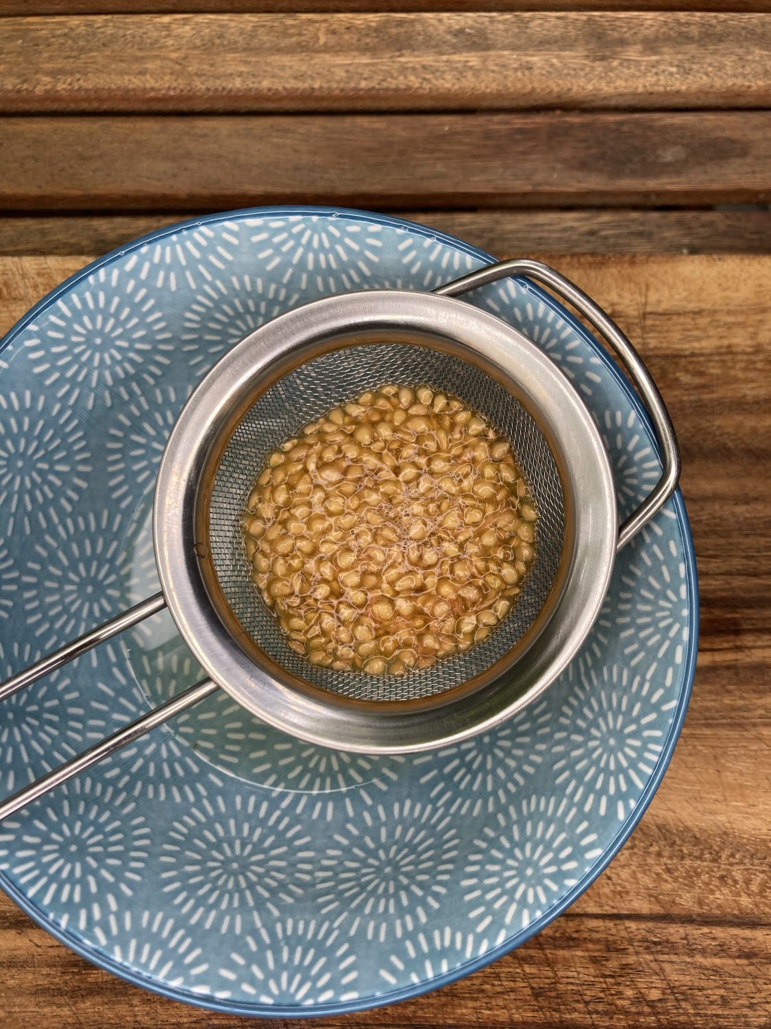 - Nach einem Tag die Samen durch ein Sieb abschütten und gründlich waschen und Fruchtfleisch Reste abspülen.