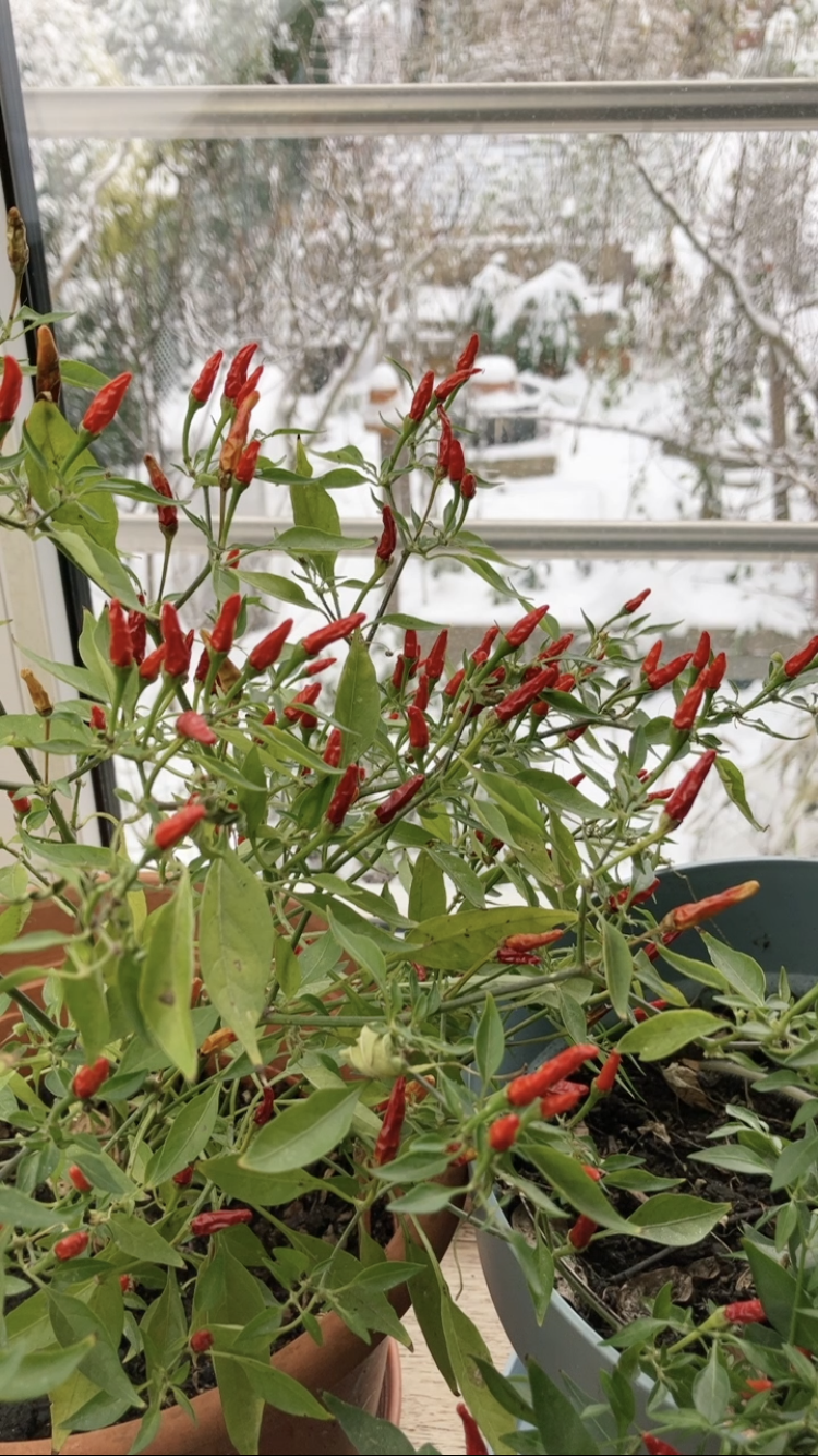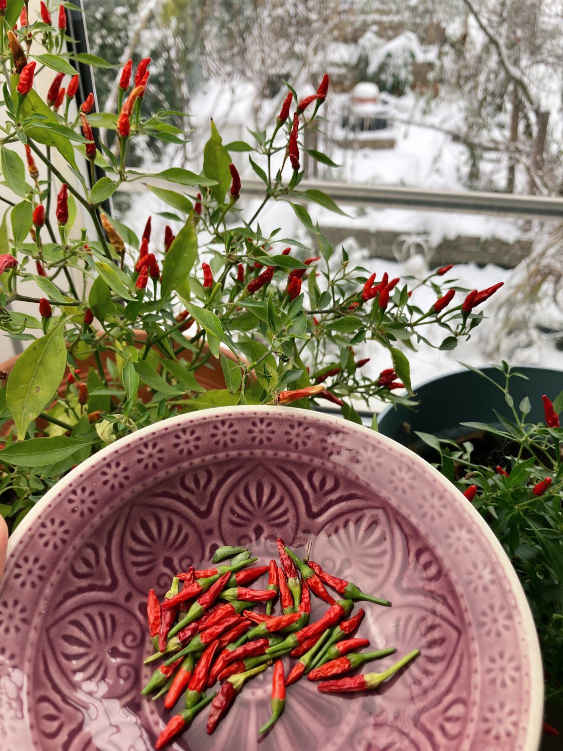Heute bin ich mal wieder in der Chili Ernte Phase. Draußen liegt der Schnee, ich schneide die Mini Chili Schoten. Gut getrocknet kommen sie dann in die Gewürzmühle. Am besten Dunkel aufbewahren, da die Farbe der Schoten schnell vergilbt.