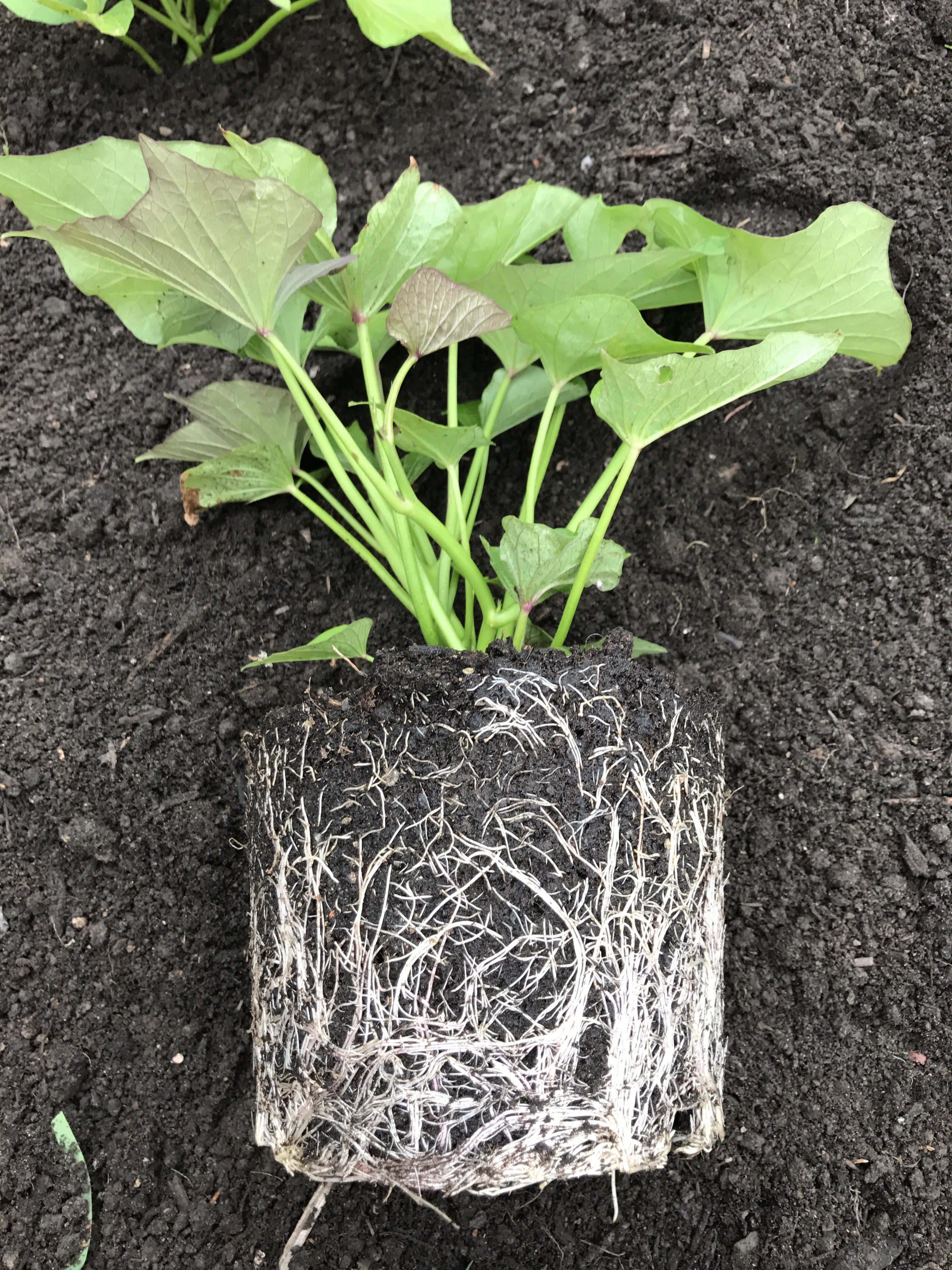 4 der Pflanzen haben ein richtig gutes Wurzelwerk im Topf gebildet. Bis zum Rand ist die Erde durchzogen von den weißen Wurzeln. Diese Süßkartoffeln habe ich in ein Hochbeet gesetzt, in einem Abstand von mindestens 30 cm zu jeder Seite. Die dunkle Erde ist gut aufgewärmt von der Sonne, immer noch feucht und voller Nährstoffe.