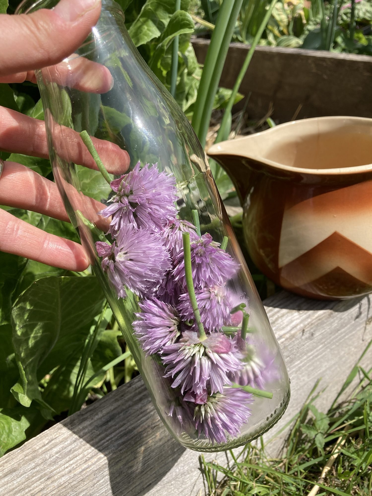 | Schnittlauch | Die vertikale Linie (Vordergrund) | Würze für das Risotto; die violetten Blütenkugeln ziehen Bienen an. |