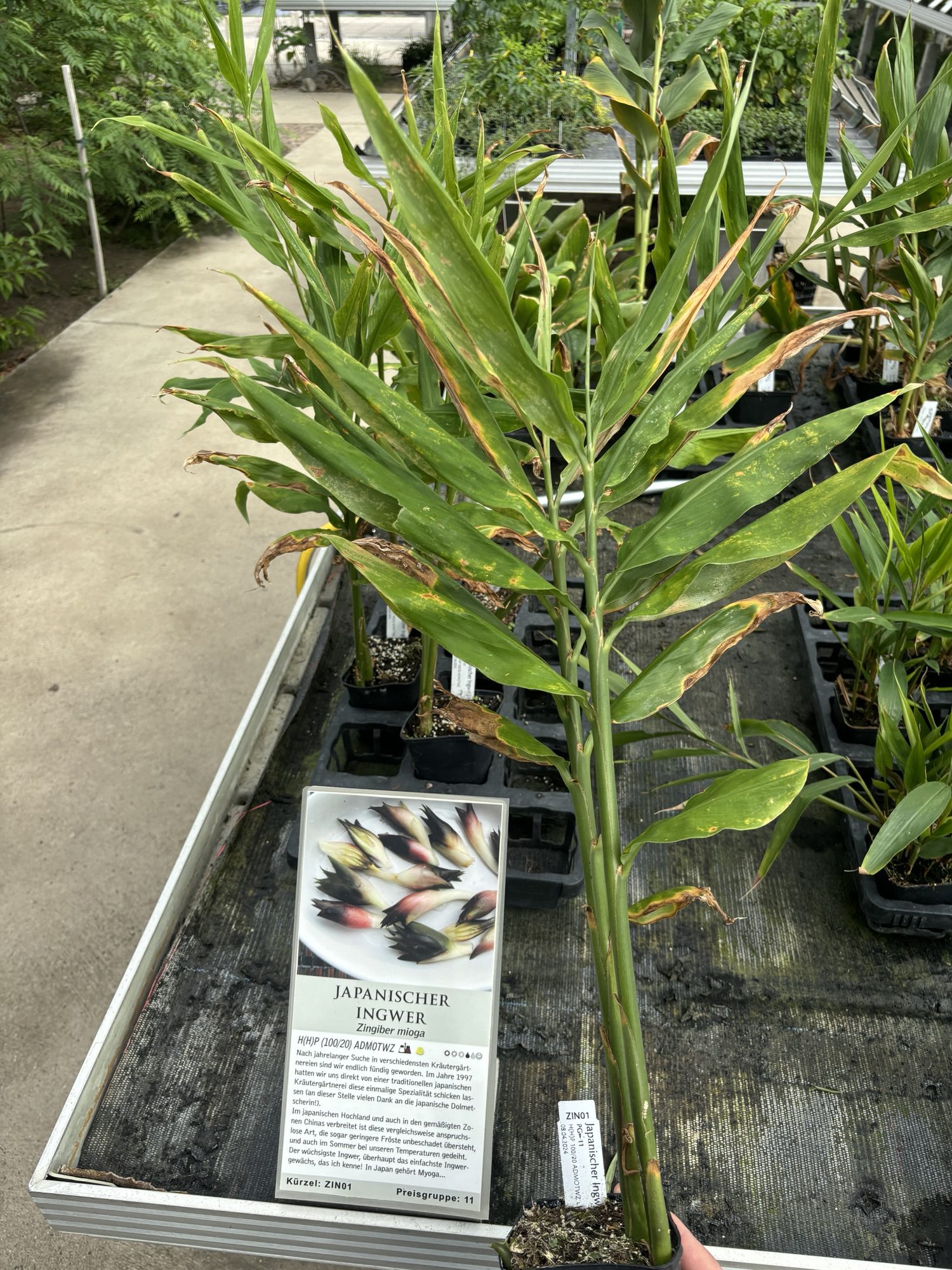 Ein gänzlich anderes Schätzchen habe ich mir 2024 bei Rühlemanns nahe Bremen besorgt. Bei meiner Erkundungstour in den Gewächshäusern ist mir eine Myoga (Zingiber mioga) Pflanze in die Hände gefallen. Von dieser Pflanze werden nicht die Wurzeln, sondern die frühen Knospen verzehrt. Was mir erst später aufgefallen ist: Diese Ingwersorte ist winterhart. Sie erträgt Temperaturen von -15 °C.