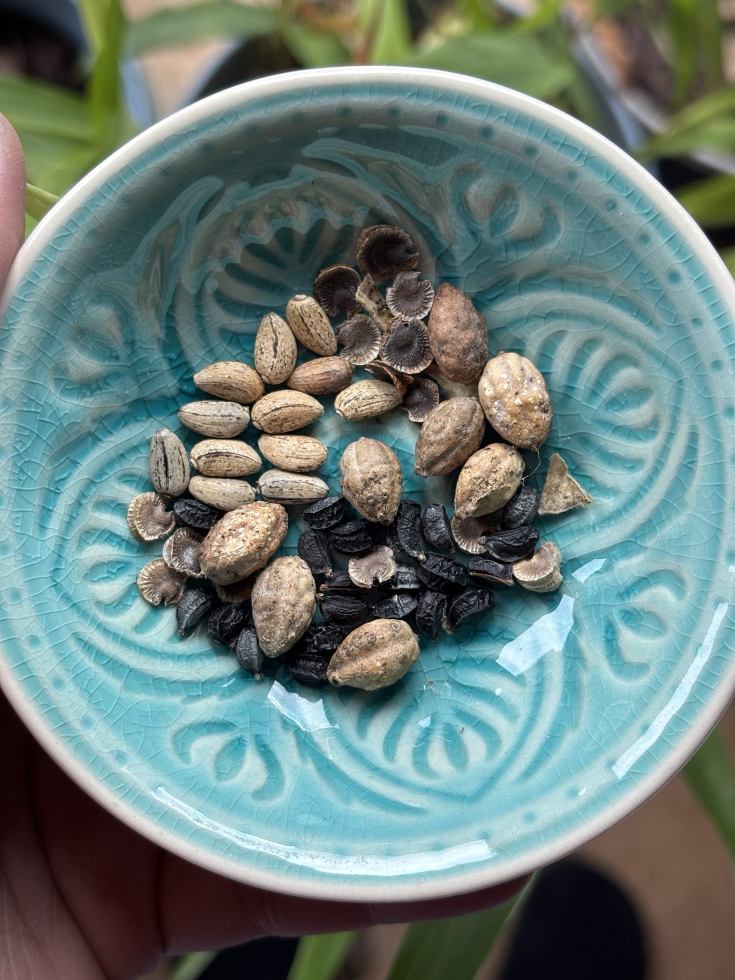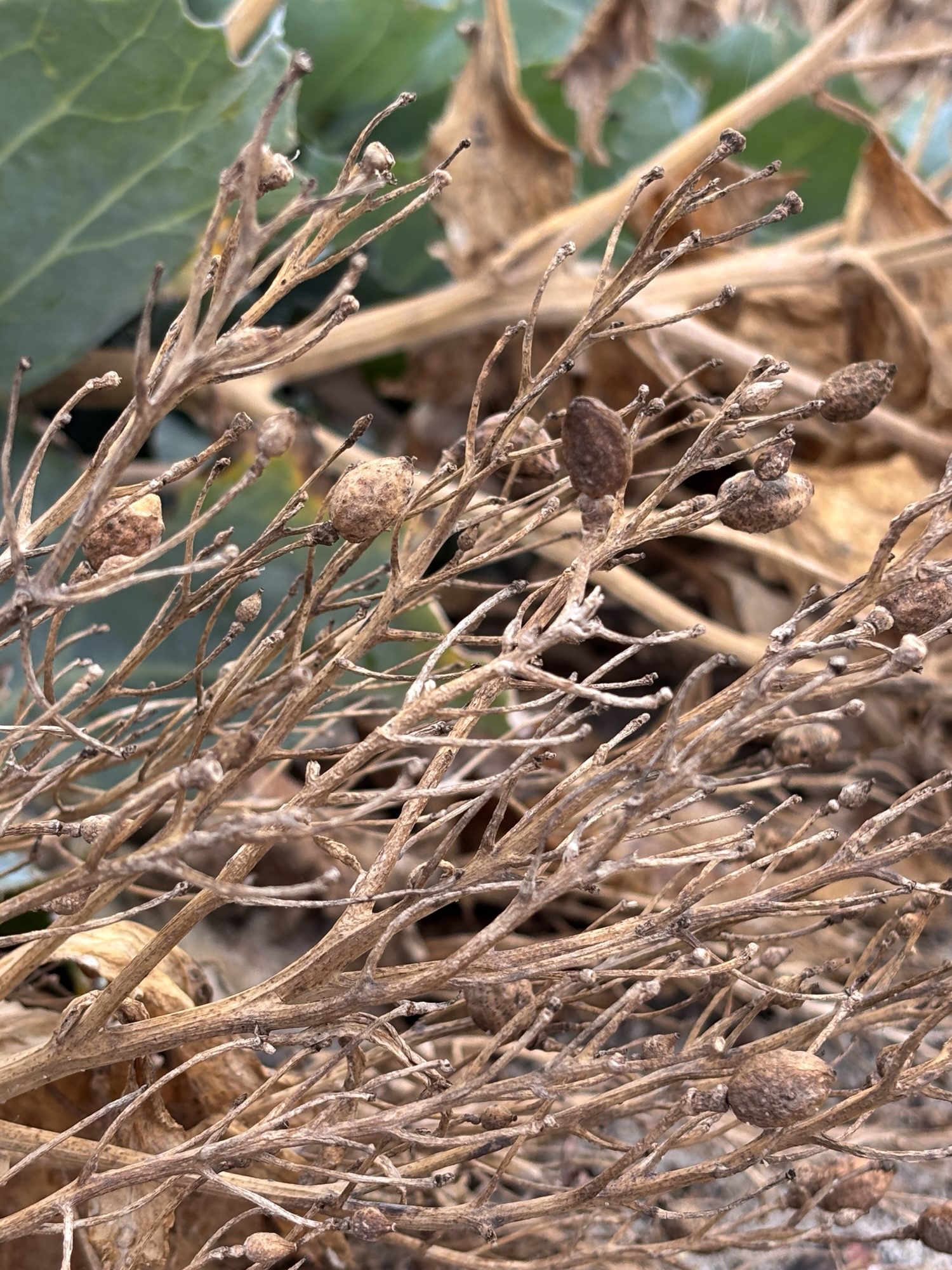 Doch eines konnte ich mitnehmen: Die Samen des Mehrkohl. Zu dem Zeitpunkt – Ende August – hingen sie zu Dutzenden an den bereits ausgetrockneten Stielen. Diese Stiele können im Mai geerntet und wie Spargel gegessen werden.
