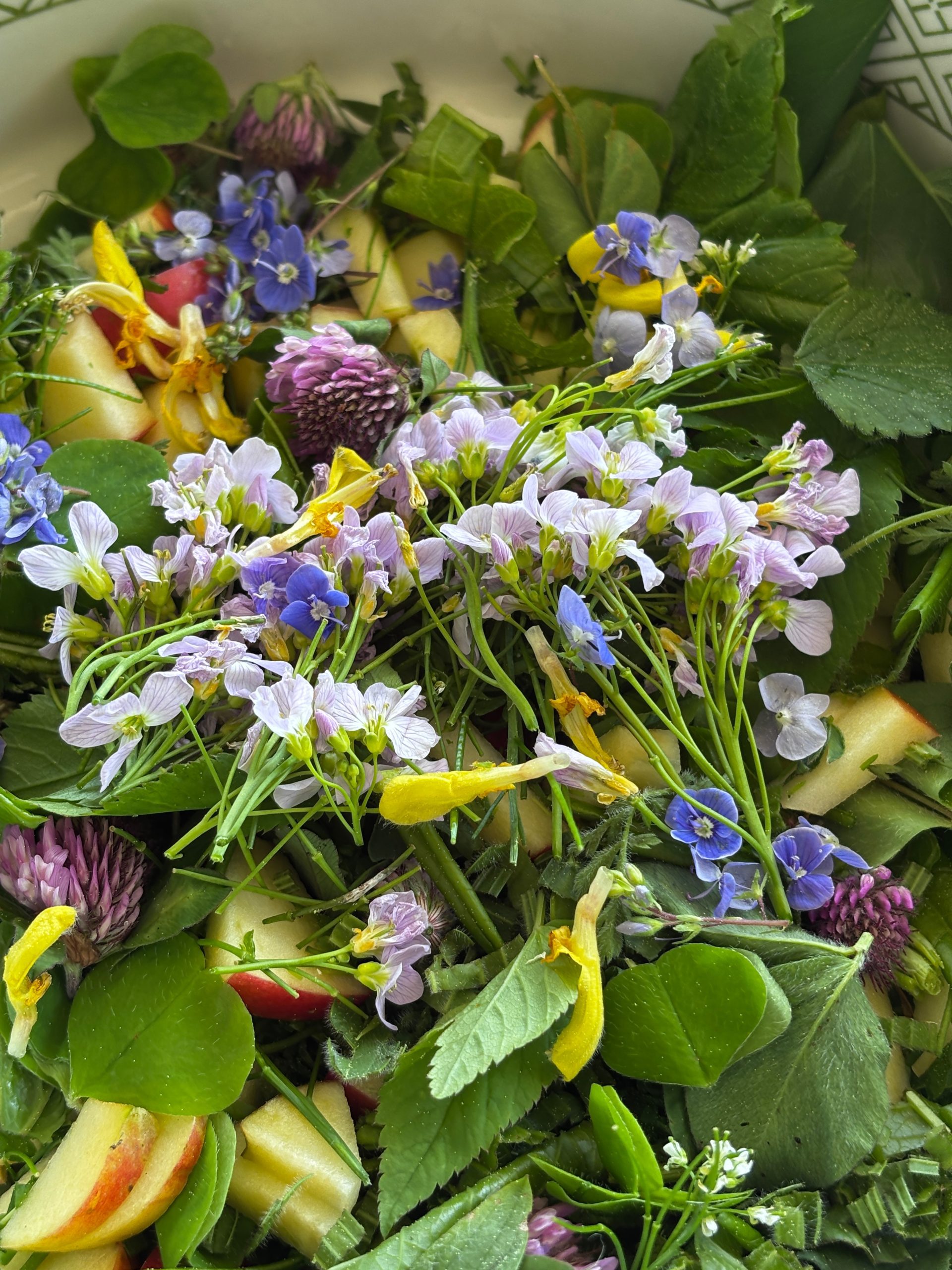 Blüten und Blätter des Wiesenschaumkraut, die Blüten der Gänseblümchen und die gelben Blütenblätter des Löwenzahn. Schnell gemacht und unglaublich lecker.
