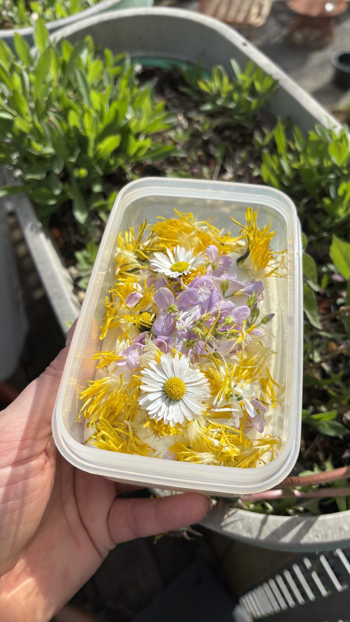 Löwenzahn und Gänseblümchen lasse ich auch im Beet wachsen. Da bin ich mir sicher, dass nichts dran kommt. Damit sie sich nicht wild vermehren, pflücke ich die verblühten Blütenköpfe immer ab.
